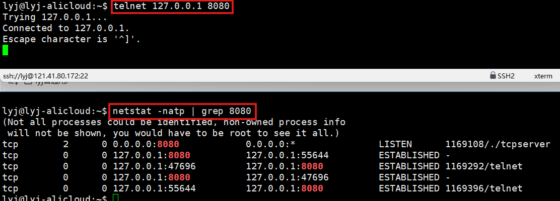先用telnet 127.0.0.1 8080连接TCP服务,然后用 netstat -natp | grep 8080 查看所有端口号是8080的。