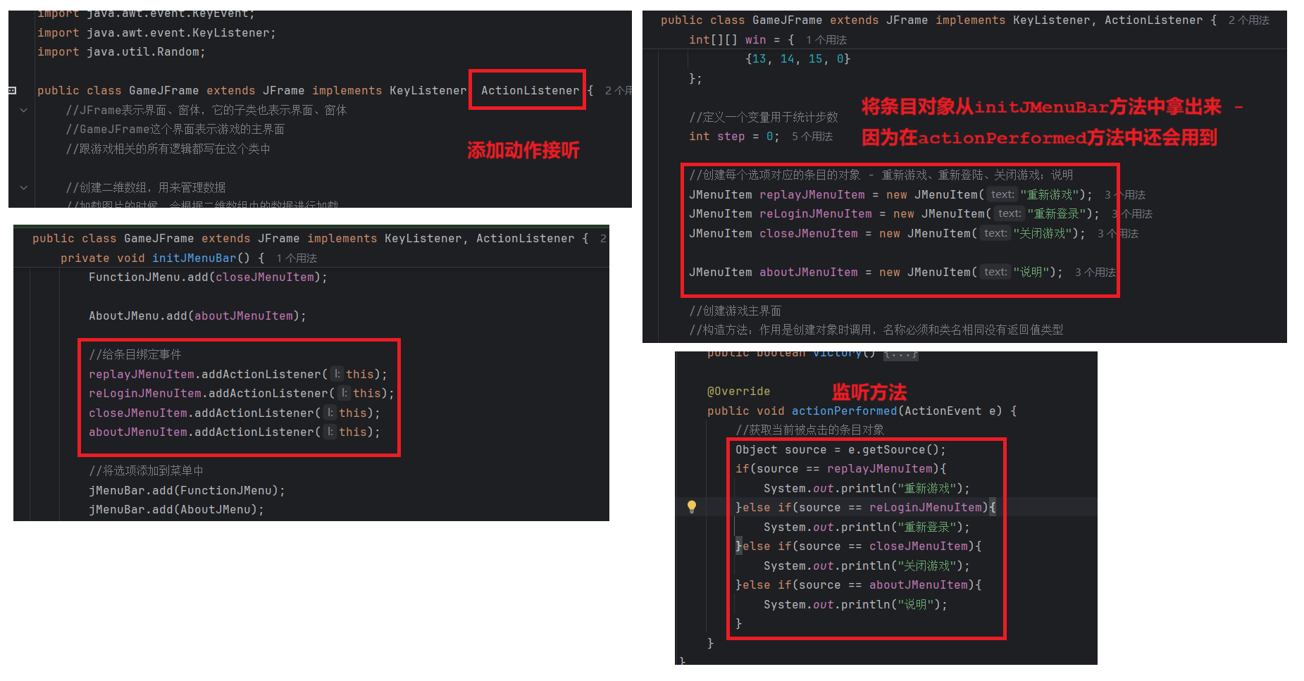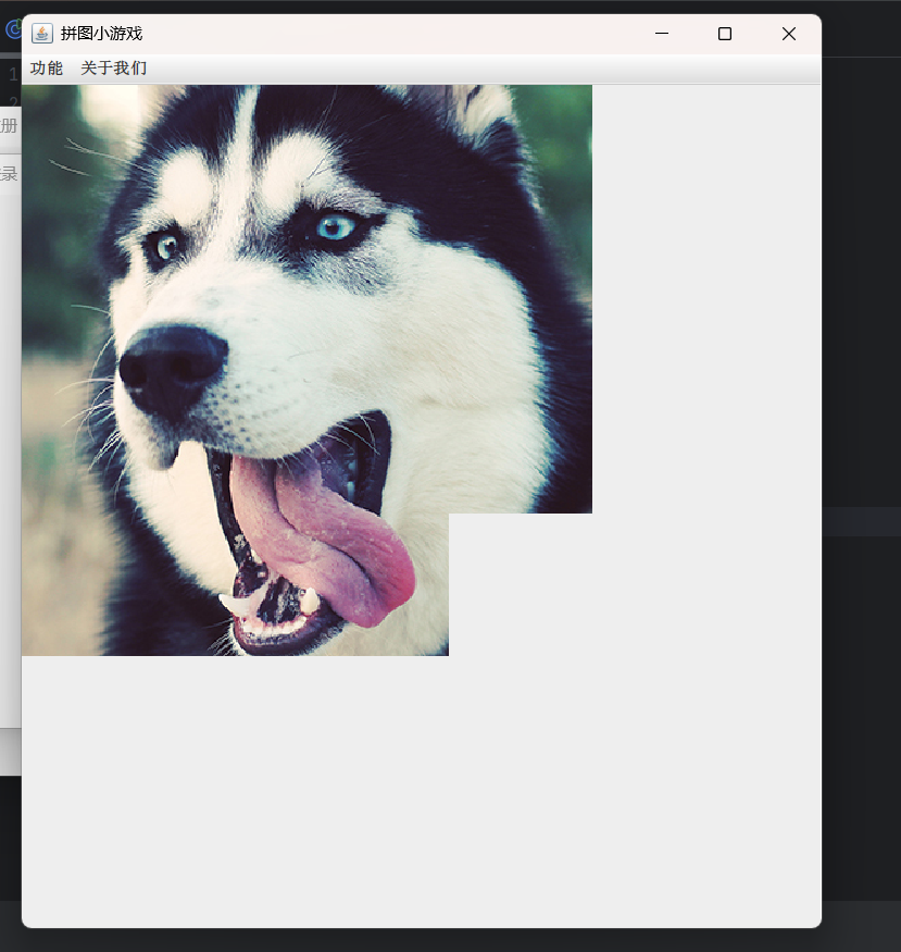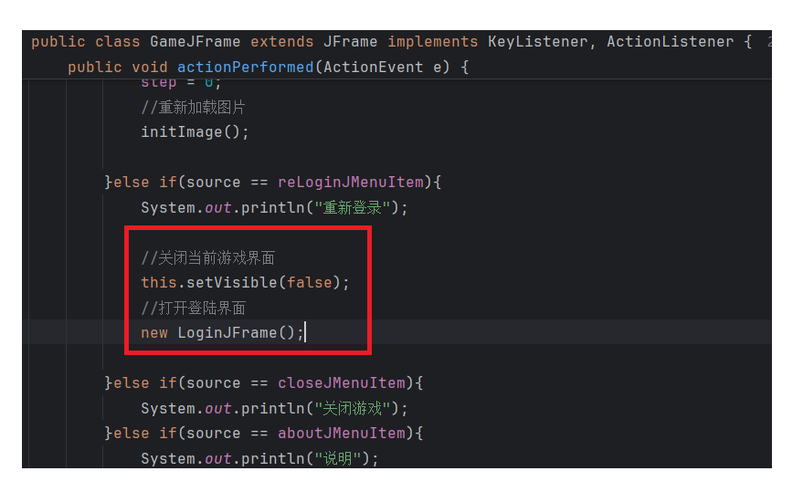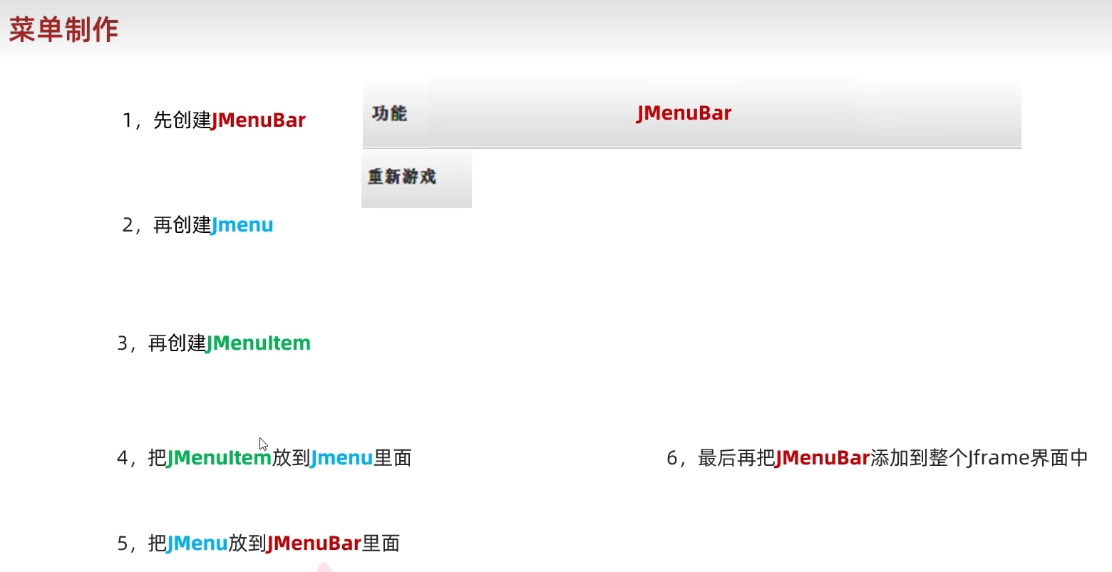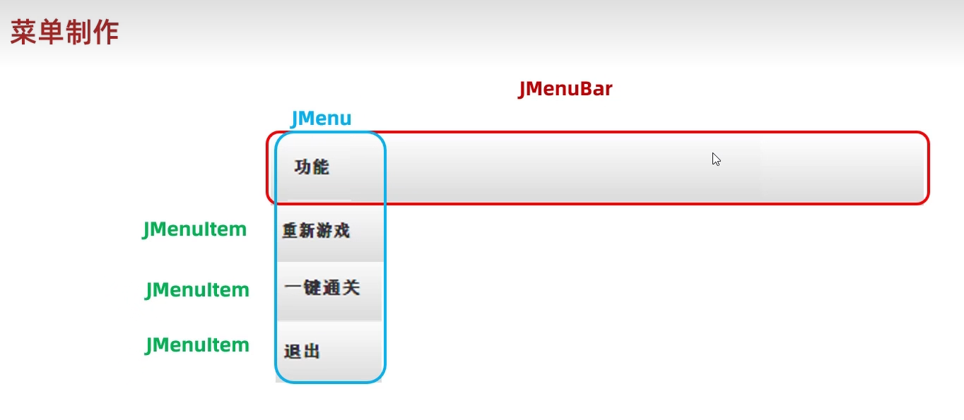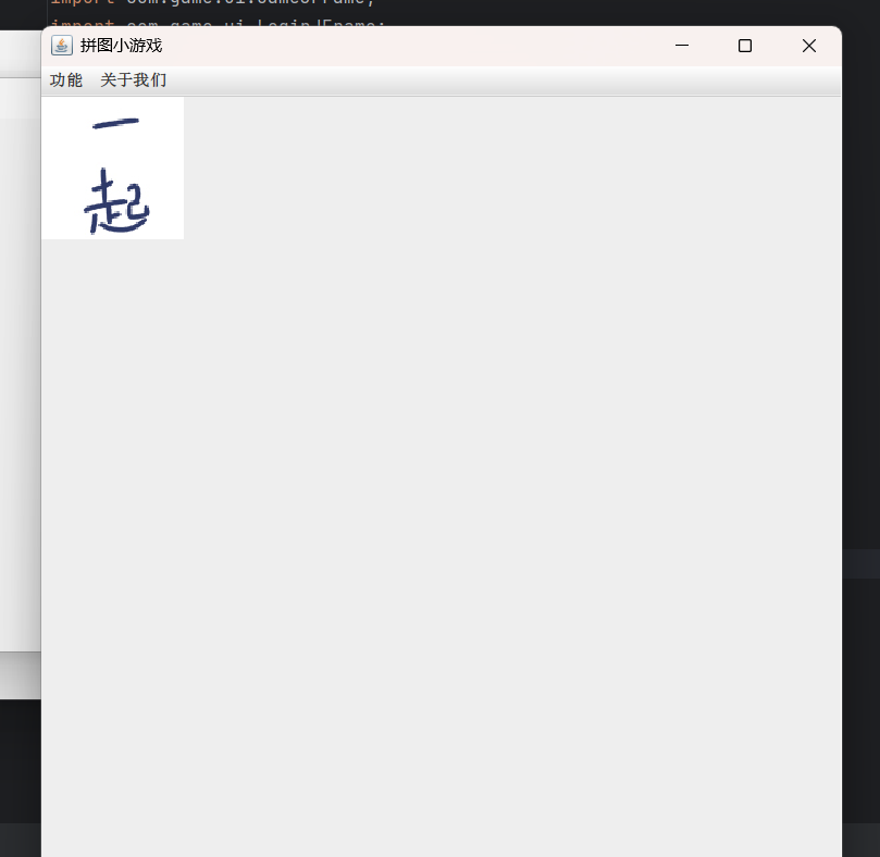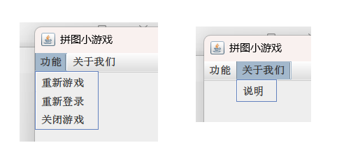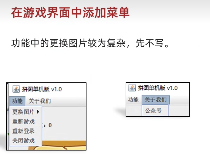 package com.game.ui;import javax.swing.*;public class GameJFrame extends JFrame {//JFrame表示界面、窗体,它的子类也表示界面、窗体//GameJFrame这个界面表示游戏的主界面//跟游戏相关的所有逻辑都写在这个类中//创建游戏主界面//构造方法:作用是创建对象时调用,名称必须和类名相同没有返回值类型public GameJFrame() {//设置界面宽高this.setSize(603, 680);//设置界面标题this.setTitle("拼图小游戏");//设置界面置顶this.setAlwaysOnTop(true);//设置界面居中this.setLocationRelativeTo(null);//设置关闭模式this.setDefaultCloseOperation(WindowConstants.EXIT_ON_CLOSE);//创建整个菜单对象JMenuBarJMenuBar jMenuBar = new JMenuBar();//创建菜单上面的两个选项的对象 - 功能、关于我们JMenu FunctionJMenu = new JMenu("功能");JMenu AboutJMenu = new JMenu("关于我们");//创建每个选项对应的条目的对象 - 重新游戏、重新登陆、关闭游戏;说明JMenuItem replayJMenuItem = new JMenuItem("重新游戏");JMenuItem reLoginJMenuItem = new JMenuItem("重新登录");JMenuItem closeJMenuItem = new JMenuItem("关闭游戏");JMenuItem aboutJMenuItem = new JMenuItem("说明");//将每个选项对应的条目添加到对应的选项中FunctionJMenu.add(replayJMenuItem);FunctionJMenu.add(reLoginJMenuItem);FunctionJMenu.add(closeJMenuItem);AboutJMenu.add(aboutJMenuItem);//将选项添加到菜单中jMenuBar.add(FunctionJMenu);jMenuBar.add(AboutJMenu);//将菜单添加到界面中this.setJMenuBar(jMenuBar);//让游戏主界面显示出来this.setVisible(true);}