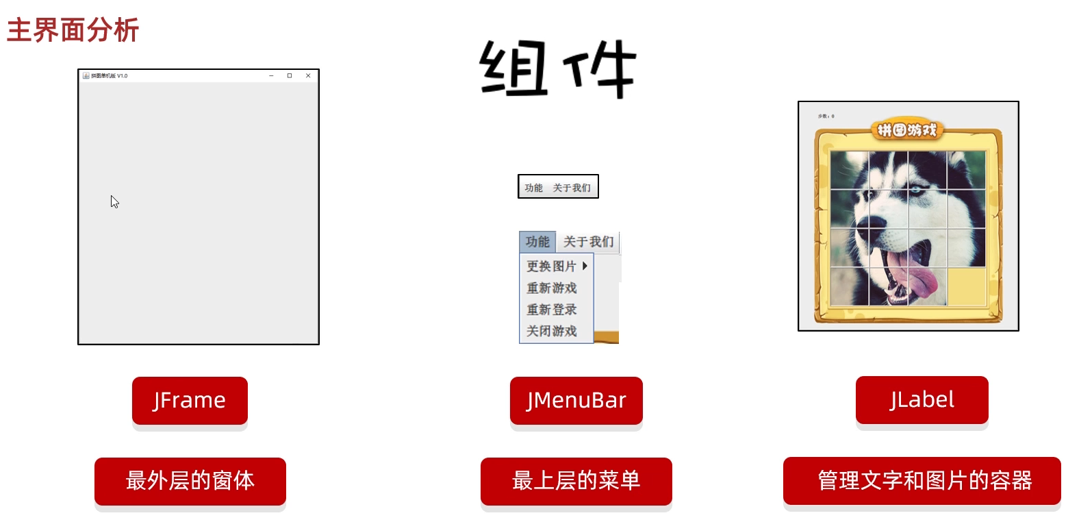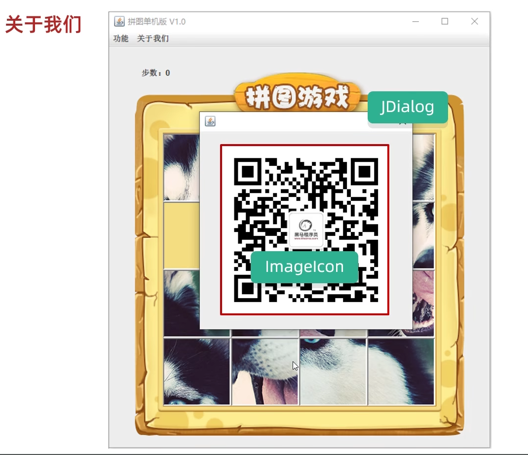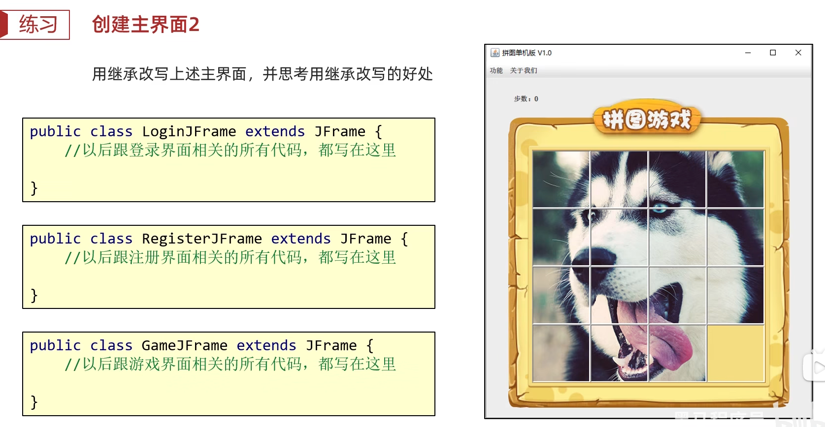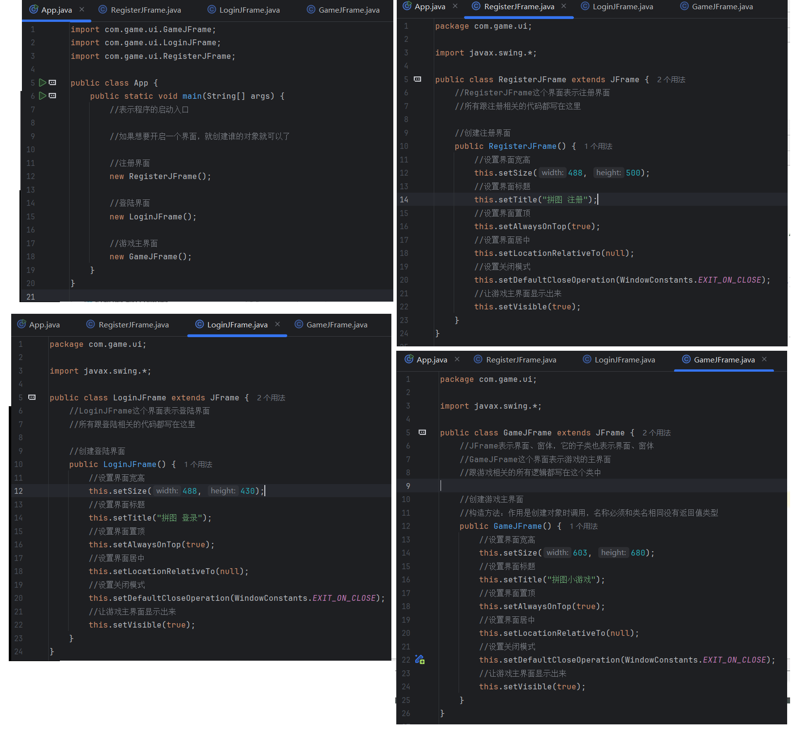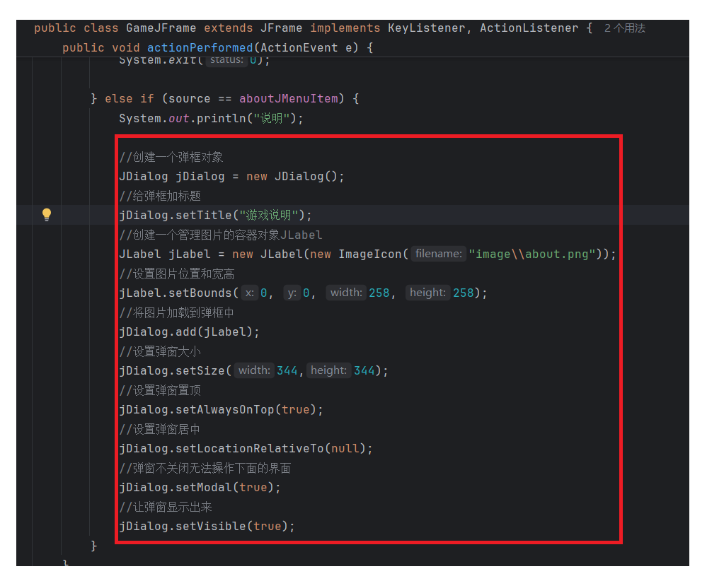 package com.game.ui;import javax.swing.*;public class GameJFrame extends JFrame {//JFrame表示界面、窗体,它的子类也表示界面、窗体//GameJFrame这个界面表示游戏的主界面//跟游戏相关的所有逻辑都写在这个类中//创建游戏主界面//构造方法:作用是创建对象时调用,名称必须和类名相同没有返回值类型public GameJFrame() {//设置界面宽高this.setSize(603, 680);//设置界面标题this.setTitle("拼图小游戏");//设置界面置顶this.setAlwaysOnTop(true);//设置界面居中this.setLocationRelativeTo(null);//设置关闭模式this.setDefaultCloseOperation(WindowConstants.EXIT_ON_CLOSE);//创建整个菜单对象JMenuBarJMenuBar jMenuBar = new JMenuBar();//创建菜单上面的两个选项的对象 - 功能、关于我们JMenu FunctionJMenu = new JMenu("功能");JMenu AboutJMenu = new JMenu("关于我们");//创建每个选项对应的条目的对象 - 重新游戏、重新登陆、关闭游戏;说明JMenuItem replayJMenuItem = new JMenuItem("重新游戏");JMenuItem reLoginJMenuItem = new JMenuItem("重新登录");JMenuItem closeJMenuItem = new JMenuItem("关闭游戏");JMenuItem aboutJMenuItem = new JMenuItem("说明");//将每个选项对应的条目添加到对应的选项中FunctionJMenu.add(replayJMenuItem);FunctionJMenu.add(reLoginJMenuItem);FunctionJMenu.add(closeJMenuItem);AboutJMenu.add(aboutJMenuItem);//将选项添加到菜单中jMenuBar.add(FunctionJMenu);jMenuBar.add(AboutJMenu);//将菜单添加到界面中this.setJMenuBar(jMenuBar);//让游戏主界面显示出来this.setVisible(true);}
