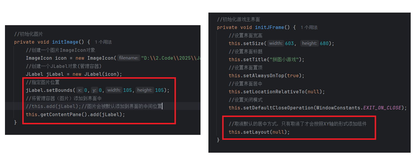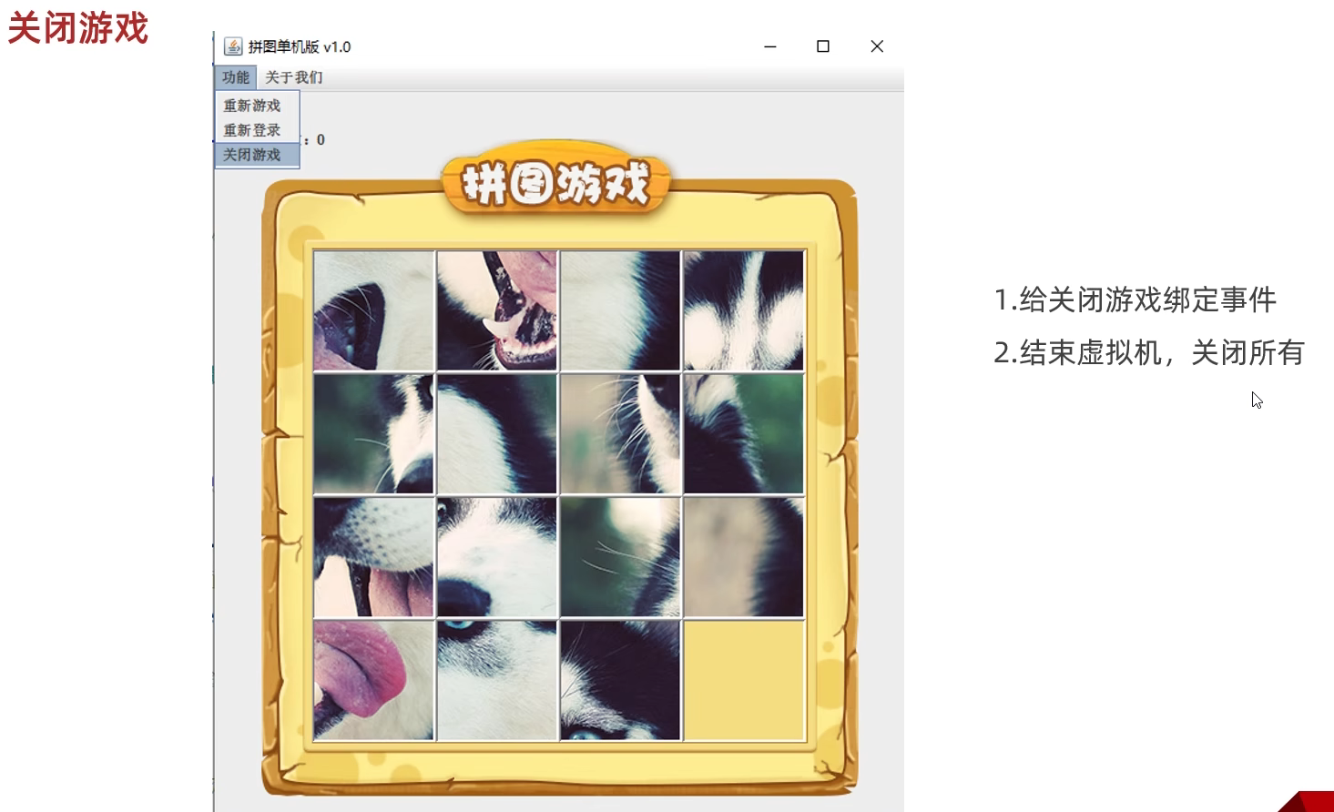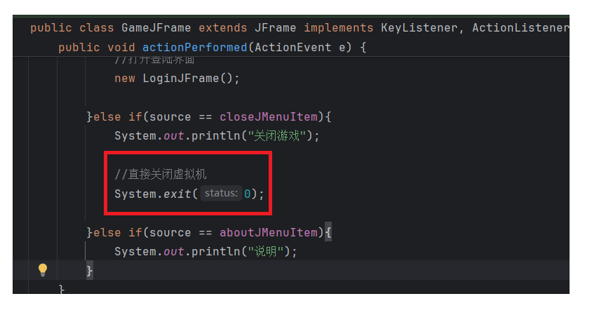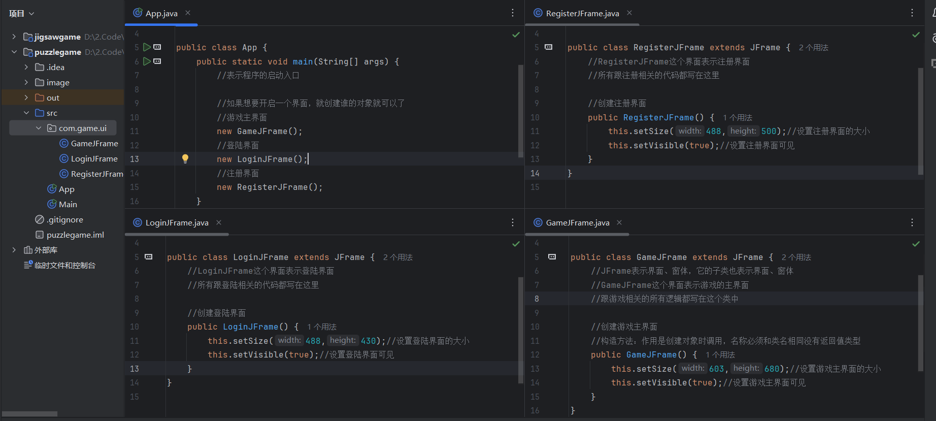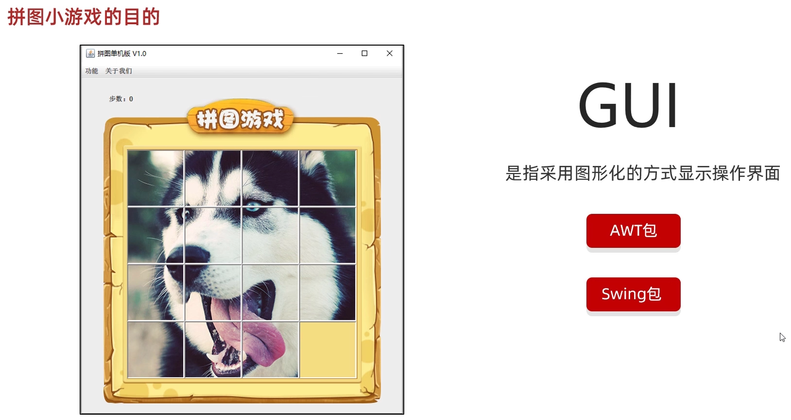 package com.game.ui;import javax.swing.*;public class GameJFrame extends JFrame {//JFrame表示界面、窗体,它的子类也表示界面、窗体//GameJFrame这个界面表示游戏的主界面//跟游戏相关的所有逻辑都写在这个类中//创建游戏主界面//构造方法:作用是创建对象时调用,名称必须和类名相同没有返回值类型public GameJFrame() {//设置界面宽高this.setSize(603, 680);//设置界面标题this.setTitle("拼图小游戏");//设置界面置顶this.setAlwaysOnTop(true);//设置界面居中this.setLocationRelativeTo(null);//设置关闭模式this.setDefaultCloseOperation(WindowConstants.EXIT_ON_CLOSE);//创建整个菜单对象JMenuBarJMenuBar jMenuBar = new JMenuBar();//创建菜单上面的两个选项的对象 - 功能、关于我们JMenu FunctionJMenu = new JMenu("功能");JMenu AboutJMenu = new JMenu("关于我们");//创建每个选项对应的条目的对象 - 重新游戏、重新登陆、关闭游戏;说明JMenuItem replayJMenuItem = new JMenuItem("重新游戏");JMenuItem reLoginJMenuItem = new JMenuItem("重新登录");JMenuItem closeJMenuItem = new JMenuItem("关闭游戏");JMenuItem aboutJMenuItem = new JMenuItem("说明");//将每个选项对应的条目添加到对应的选项中FunctionJMenu.add(replayJMenuItem);FunctionJMenu.add(reLoginJMenuItem);FunctionJMenu.add(closeJMenuItem);AboutJMenu.add(aboutJMenuItem);//将选项添加到菜单中jMenuBar.add(FunctionJMenu);jMenuBar.add(AboutJMenu);//将菜单添加到界面中this.setJMenuBar(jMenuBar);//让游戏主界面显示出来this.setVisible(true);}