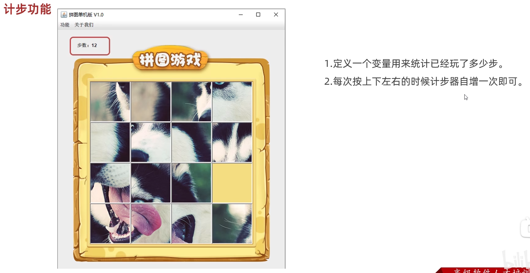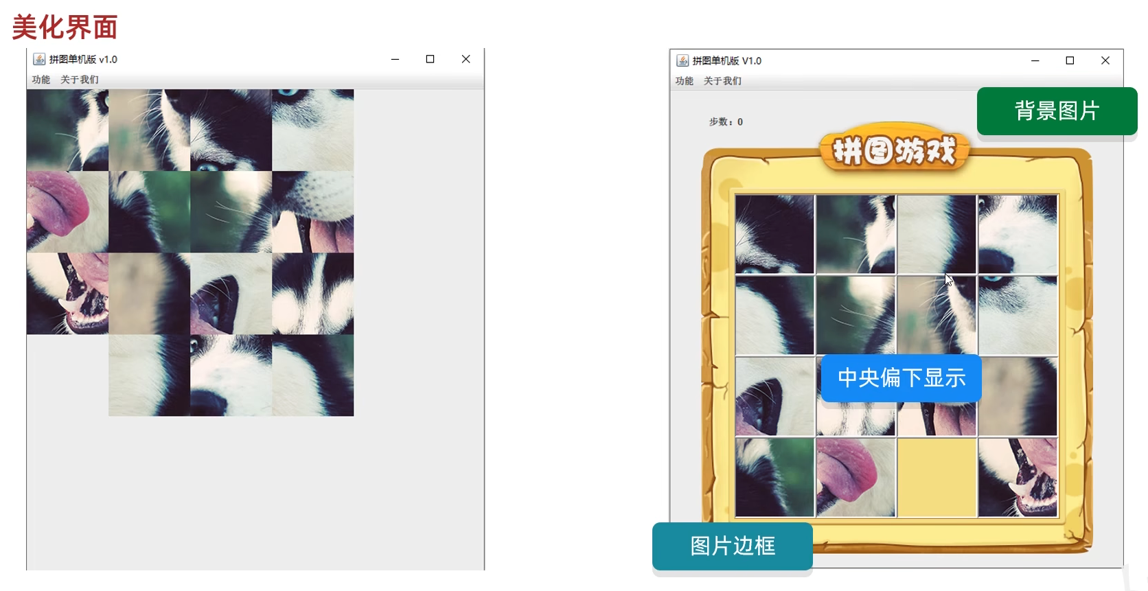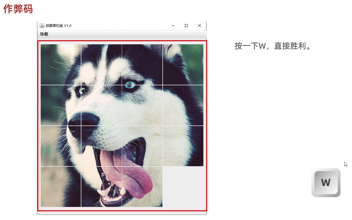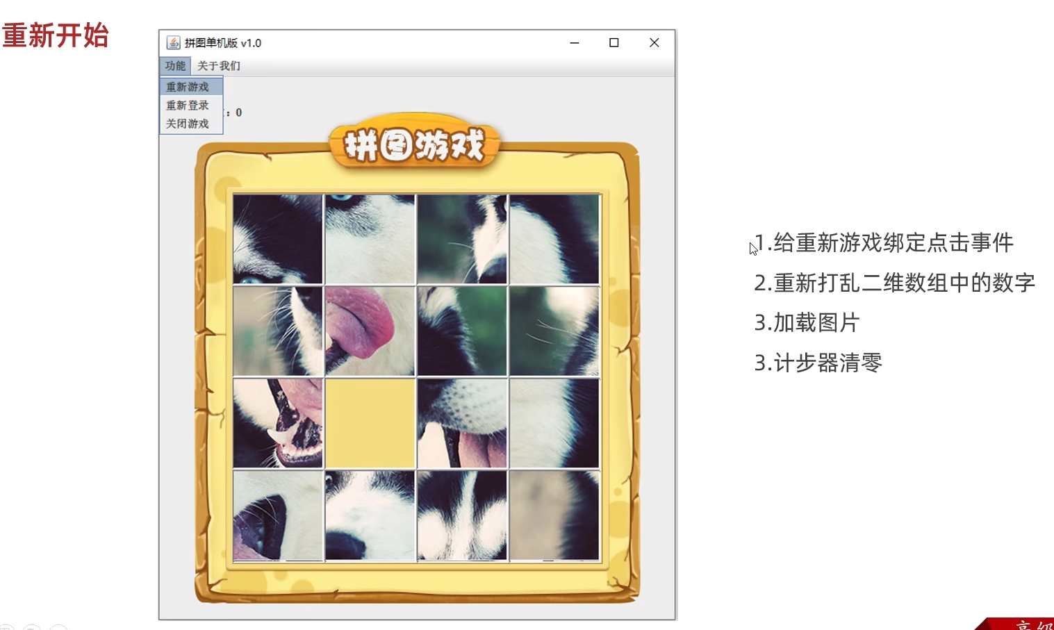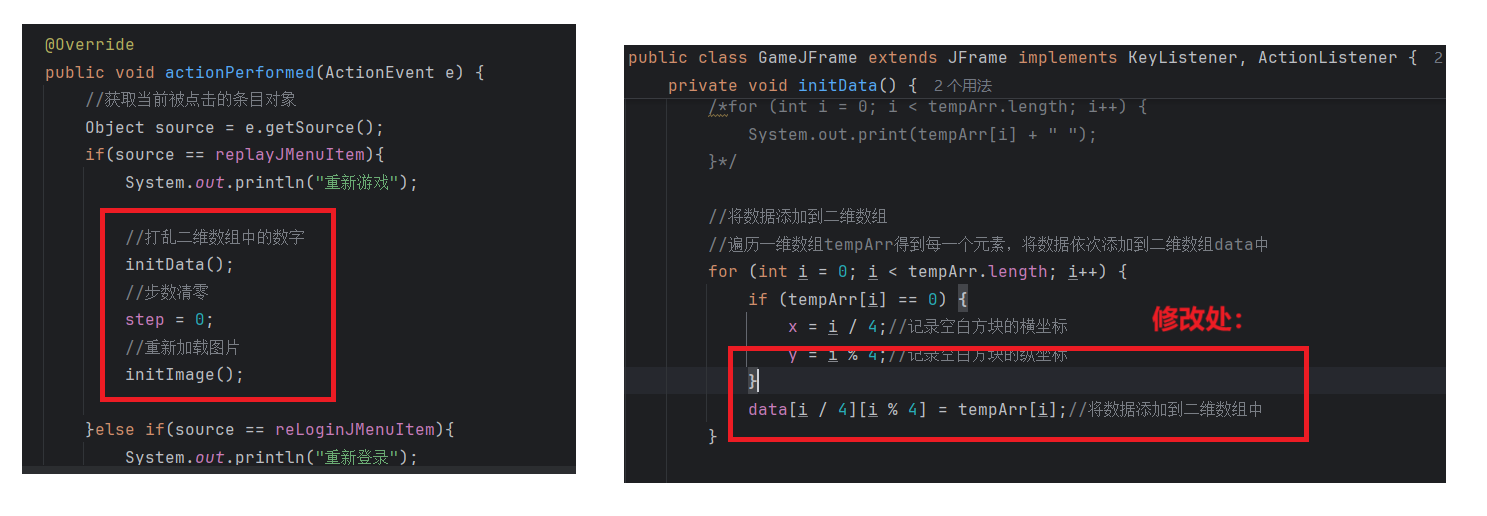 package com.game.ui;import javax.swing.*;public class GameJFrame extends JFrame {//JFrame表示界面、窗体,它的子类也表示界面、窗体//GameJFrame这个界面表示游戏的主界面//跟游戏相关的所有逻辑都写在这个类中//创建游戏主界面//构造方法:作用是创建对象时调用,名称必须和类名相同没有返回值类型public GameJFrame() {//设置界面宽高this.setSize(603, 680);//设置界面标题this.setTitle("拼图小游戏");//设置界面置顶this.setAlwaysOnTop(true);//设置界面居中this.setLocationRelativeTo(null);//设置关闭模式this.setDefaultCloseOperation(WindowConstants.EXIT_ON_CLOSE);//创建整个菜单对象JMenuBarJMenuBar jMenuBar = new JMenuBar();//创建菜单上面的两个选项的对象 - 功能、关于我们JMenu FunctionJMenu = new JMenu("功能");JMenu AboutJMenu = new JMenu("关于我们");//创建每个选项对应的条目的对象 - 重新游戏、重新登陆、关闭游戏;说明JMenuItem replayJMenuItem = new JMenuItem("重新游戏");JMenuItem reLoginJMenuItem = new JMenuItem("重新登录");JMenuItem closeJMenuItem = new JMenuItem("关闭游戏");JMenuItem aboutJMenuItem = new JMenuItem("说明");//将每个选项对应的条目添加到对应的选项中FunctionJMenu.add(replayJMenuItem);FunctionJMenu.add(reLoginJMenuItem);FunctionJMenu.add(closeJMenuItem);AboutJMenu.add(aboutJMenuItem);//将选项添加到菜单中jMenuBar.add(FunctionJMenu);jMenuBar.add(AboutJMenu);//将菜单添加到界面中this.setJMenuBar(jMenuBar);//让游戏主界面显示出来this.setVisible(true);}