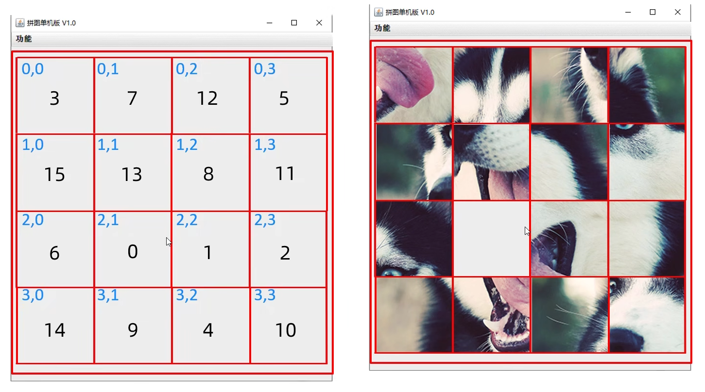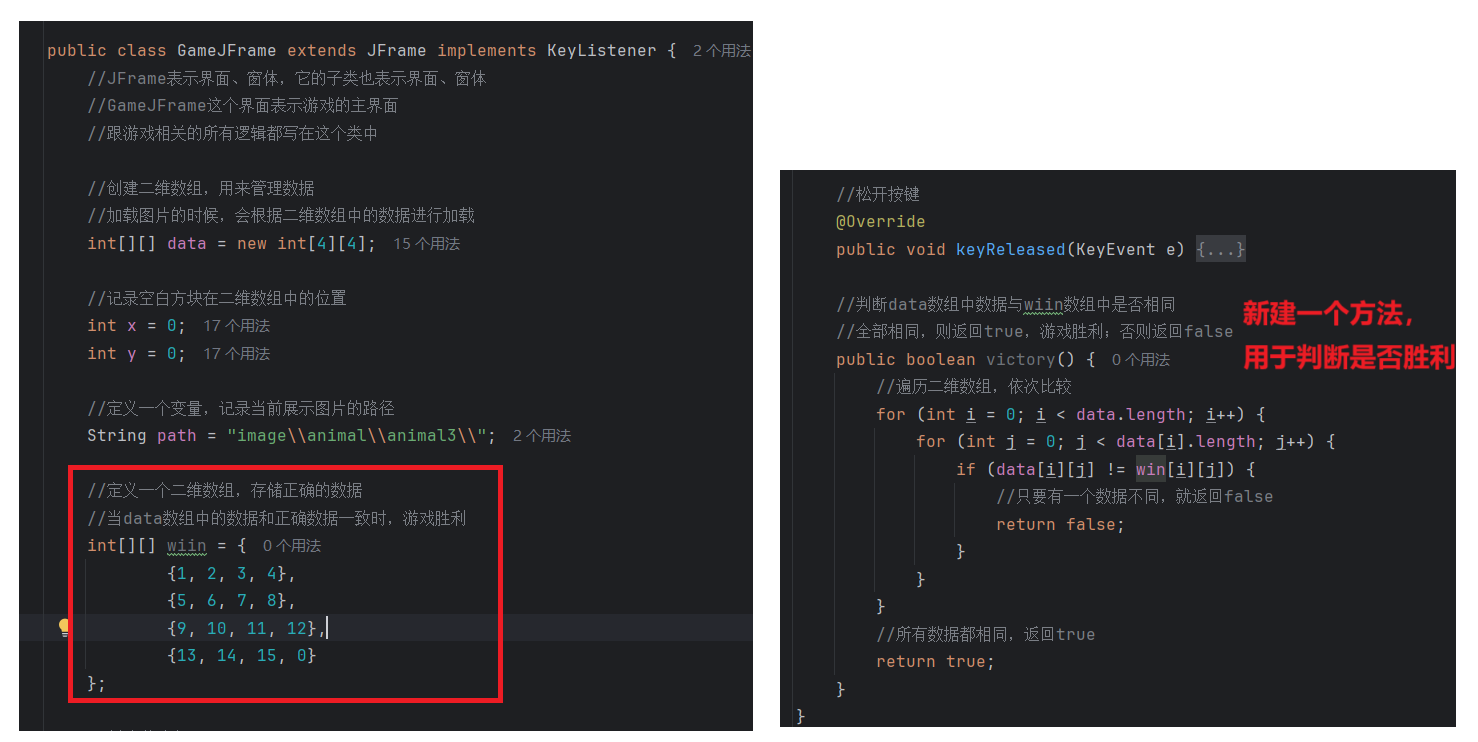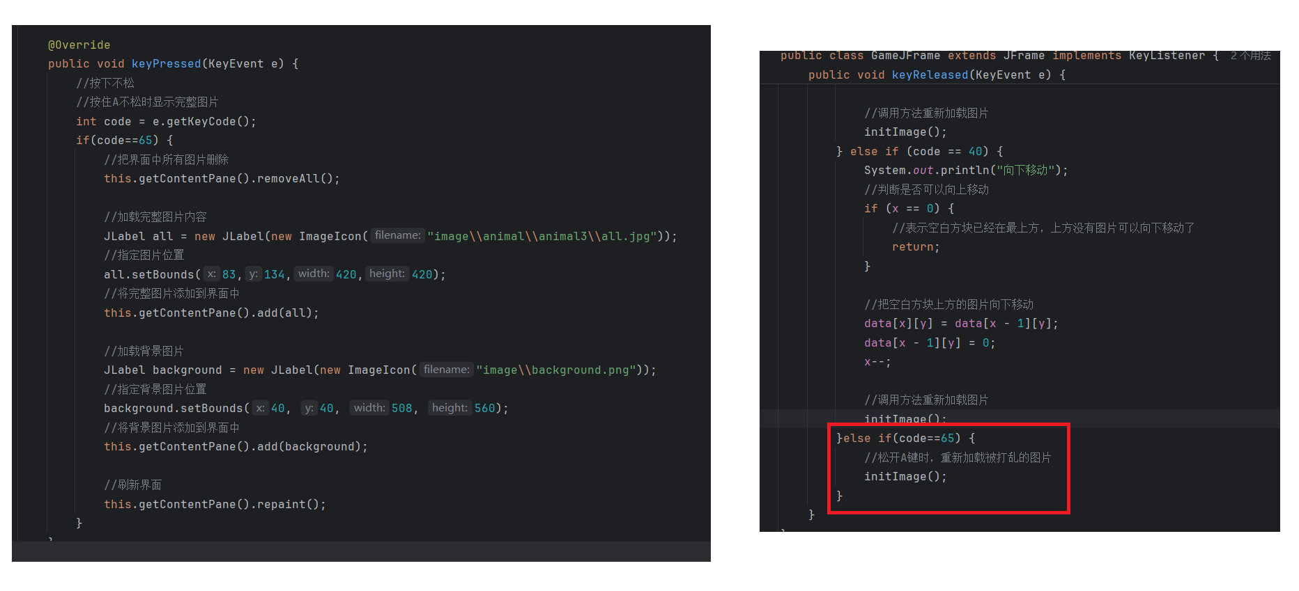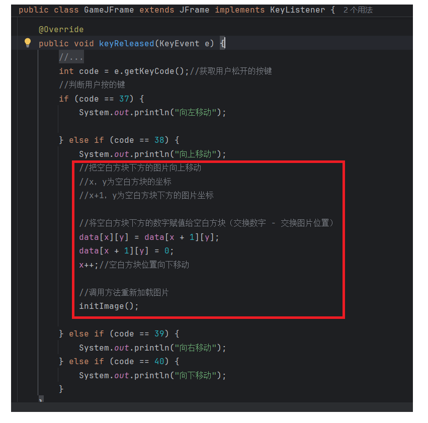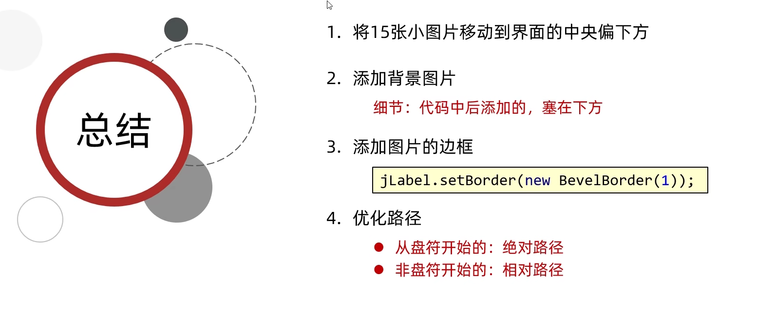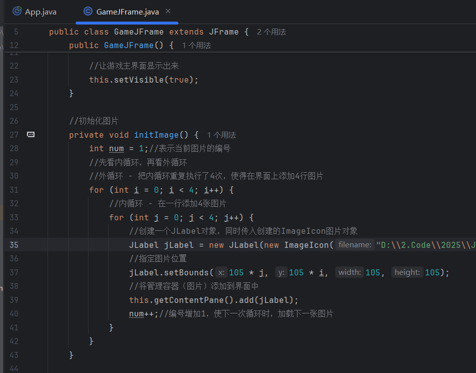 //初始化图片//添加图片的时候,根据二维数组中管理的数据进行添加private void initImage() {//路径分为两种://绝对路径:一定是从盘符开始的//相对路径:不是从盘符开始的,是相对当前项目而言的//细节:先加载的图片在上方,后加载的图片被塞在下方//先看内循环,再看外循环//外循环 - 把内循环重复执行了4次,使得在界面上添加4行图片for (int i = 0; i < 4; i++) {//内循环 - 在一行添加4张图片for (int j = 0; j < 4; j++) {//获取当前要加载的图片的编号int num = data[i][j];//创建一个JLabel对象,同时传入创建的ImageIcon图片对象JLabel jLabel = new JLabel(new ImageIcon("image\\animal\\animal3\\" + num + ".jpg"));//图片要先添加到JLabel中,才能通过JLabel把图片添加到界面中//指定图片位置jLabel.setBounds(105 * j + 83, 105 * i + 134, 105, 105);//给图片添加边框//0:让图片凸起来//1:让图片凹下去jLabel.setBorder(new BevelBorder(BevelBorder.LOWERED));//将管理容器(图片)添加到界面中this.getContentPane().add(jLabel);}}//添加背景图片JLabel background = new JLabel(new ImageIcon("image\\background.png"));//指定背景图片位置background.setBounds(40, 40, 508, 560);//将背景图片添加到界面中this.getContentPane().add(background);}七. 移动图片