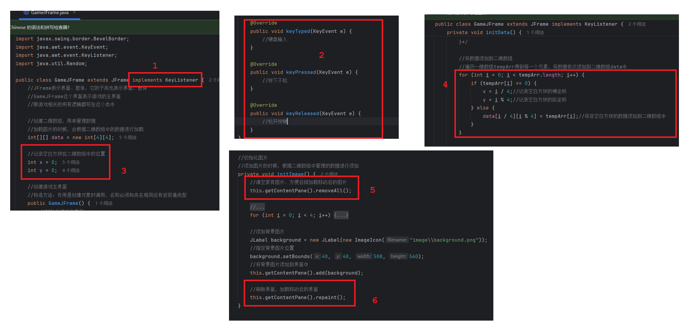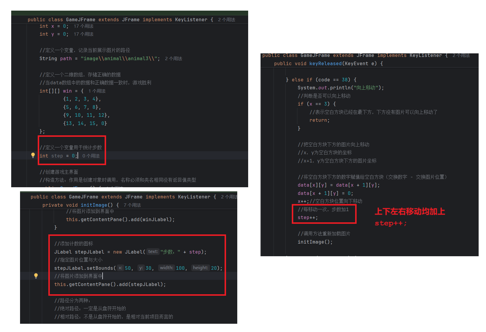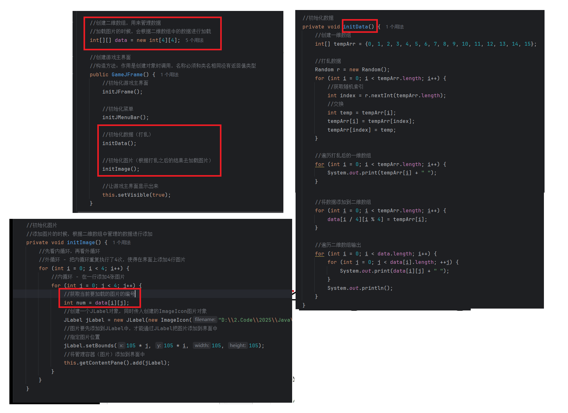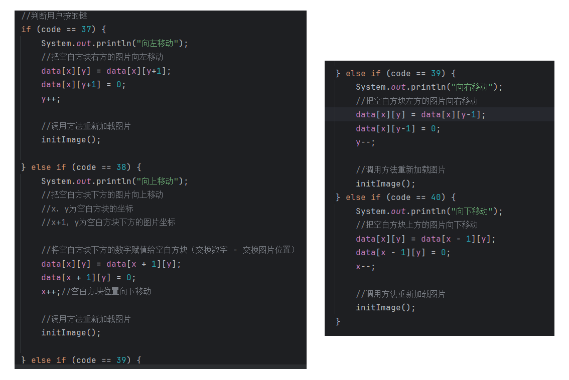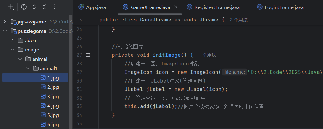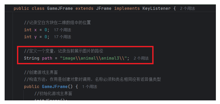 //初始化图片//添加图片的时候,根据二维数组中管理的数据进行添加private void initImage() {//路径分为两种://绝对路径:一定是从盘符开始的//相对路径:不是从盘符开始的,是相对当前项目而言的//细节:先加载的图片在上方,后加载的图片被塞在下方//先看内循环,再看外循环//外循环 - 把内循环重复执行了4次,使得在界面上添加4行图片for (int i = 0; i < 4; i++) {//内循环 - 在一行添加4张图片for (int j = 0; j < 4; j++) {//获取当前要加载的图片的编号int num = data[i][j];//创建一个JLabel对象,同时传入创建的ImageIcon图片对象JLabel jLabel = new JLabel(new ImageIcon("image\\animal\\animal3\\" + num + ".jpg"));//图片要先添加到JLabel中,才能通过JLabel把图片添加到界面中//指定图片位置jLabel.setBounds(105 * j + 83, 105 * i + 134, 105, 105);//给图片添加边框//0:让图片凸起来//1:让图片凹下去jLabel.setBorder(new BevelBorder(BevelBorder.LOWERED));//将管理容器(图片)添加到界面中this.getContentPane().add(jLabel);}}//添加背景图片JLabel background = new JLabel(new ImageIcon("image\\background.png"));//指定背景图片位置background.setBounds(40, 40, 508, 560);//将背景图片添加到界面中this.getContentPane().add(background);}七. 移动图片
