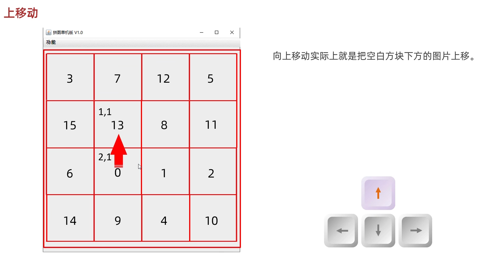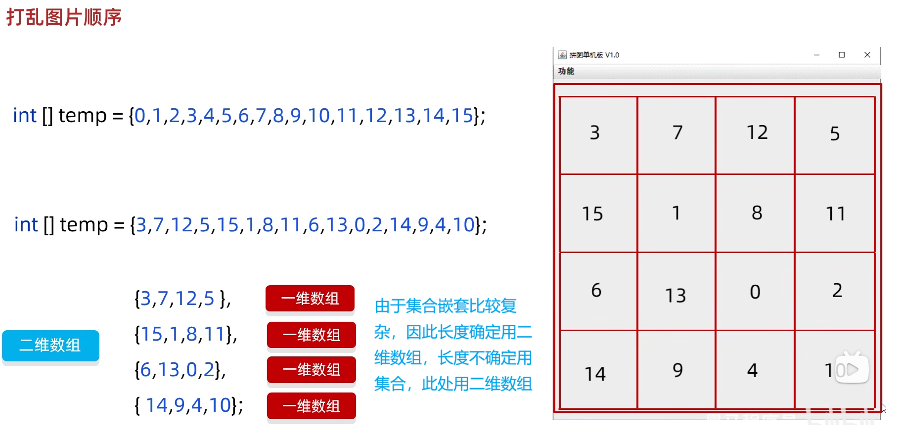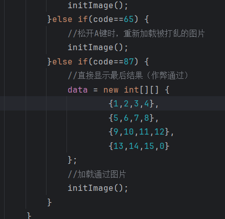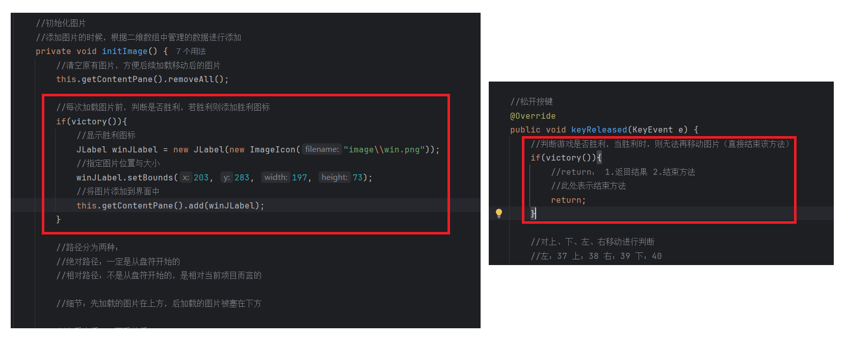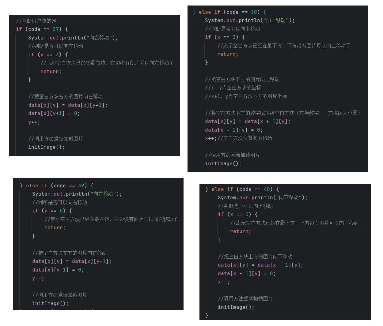 //初始化图片//添加图片的时候,根据二维数组中管理的数据进行添加private void initImage() {//路径分为两种://绝对路径:一定是从盘符开始的//相对路径:不是从盘符开始的,是相对当前项目而言的//细节:先加载的图片在上方,后加载的图片被塞在下方//先看内循环,再看外循环//外循环 - 把内循环重复执行了4次,使得在界面上添加4行图片for (int i = 0; i < 4; i++) {//内循环 - 在一行添加4张图片for (int j = 0; j < 4; j++) {//获取当前要加载的图片的编号int num = data[i][j];//创建一个JLabel对象,同时传入创建的ImageIcon图片对象JLabel jLabel = new JLabel(new ImageIcon("image\\animal\\animal3\\" + num + ".jpg"));//图片要先添加到JLabel中,才能通过JLabel把图片添加到界面中//指定图片位置jLabel.setBounds(105 * j + 83, 105 * i + 134, 105, 105);//给图片添加边框//0:让图片凸起来//1:让图片凹下去jLabel.setBorder(new BevelBorder(BevelBorder.LOWERED));//将管理容器(图片)添加到界面中this.getContentPane().add(jLabel);}}//添加背景图片JLabel background = new JLabel(new ImageIcon("image\\background.png"));//指定背景图片位置background.setBounds(40, 40, 508, 560);//将背景图片添加到界面中this.getContentPane().add(background);}七. 移动图片