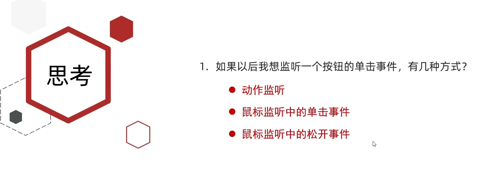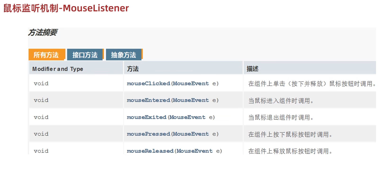 import java.awt.event.MouseListener;public class MyJFrame2 extends JFrame implements MouseListener {//创建一个按钮对象JButton jtb1 = new JButton("点我呀");public MyJFrame2() {//设置界面的宽高this.setSize(603, 680);//设置界面的标题this.setTitle("事件演示");//设置界面置顶this.setAlwaysOnTop(true);//设置界面居中this.setLocationRelativeTo(null);//设置关闭模式this.setDefaultCloseOperation(3);//取消默认居中方式this.setLayout(null);//设置按钮的位置和宽高jtb1.setBounds(0,0,100,50);//给按钮绑定鼠标事件jtb1.addMouseListener(this);//把按钮添加到界面中this.getContentPane().add(jtb1);//设置界面可见this.setVisible(true);}@Overridepublic void mouseClicked(MouseEvent e) {System.out.println("单击");}@Overridepublic void mousePressed(MouseEvent e) {System.out.println("按下不松");}@Overridepublic void mouseReleased(MouseEvent e) {System.out.println("松开");}@Overridepublic void mouseEntered(MouseEvent e) {System.out.println("划入");}@Overridepublic void mouseExited(MouseEvent e) {System.out.println("划出");}