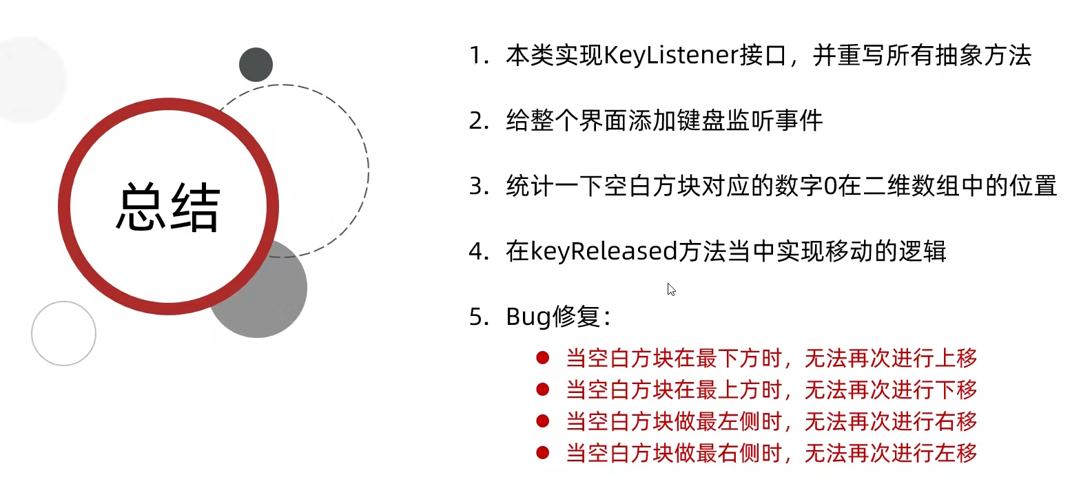 import java.awt.event.KeyListener;public class MyJFrame3 extends JFrame implements KeyListener {public MyJFrame3() {//设置界面的宽高this.setSize(603, 680);//设置界面的标题this.setTitle("事件演示");//设置界面置顶this.setAlwaysOnTop(true);//设置界面居中this.setLocationRelativeTo(null);//设置关闭模式this.setDefaultCloseOperation(3);//取消默认居中方式this.setLayout(null);//给整个窗口添加键盘监听//调用者this:苯类对象,当前的界面对象,表示我要给整个界面添加监听//addKeyListener:表示要给本界面添加键盘监听//参数this:当事件被触发后,会执行本类中对应的代码this.addKeyListener(this);//设置界面可见this.setVisible(true);}@Overridepublic void keyTyped(KeyEvent e) {}@Override//细节1://细节2:public void keyPressed(KeyEvent e) {System.out.println("按下不松");}@Overridepublic void keyReleased(KeyEvent e) {System.out.println("松开按键");//获取键盘上每一个键盘的编号/*int code = e.getKeyCode();System.out.println(code);*/int code = e.getKeyCode();if(code==65){System.out.println("现在按的是A键");}else if(code==68){System.out.println("现在按的是D键");}}