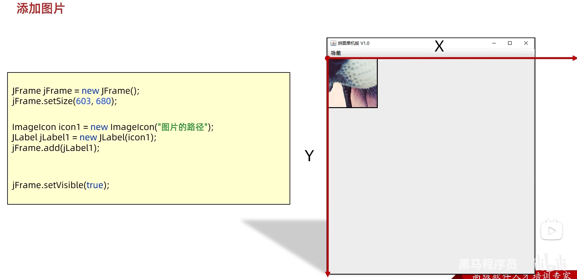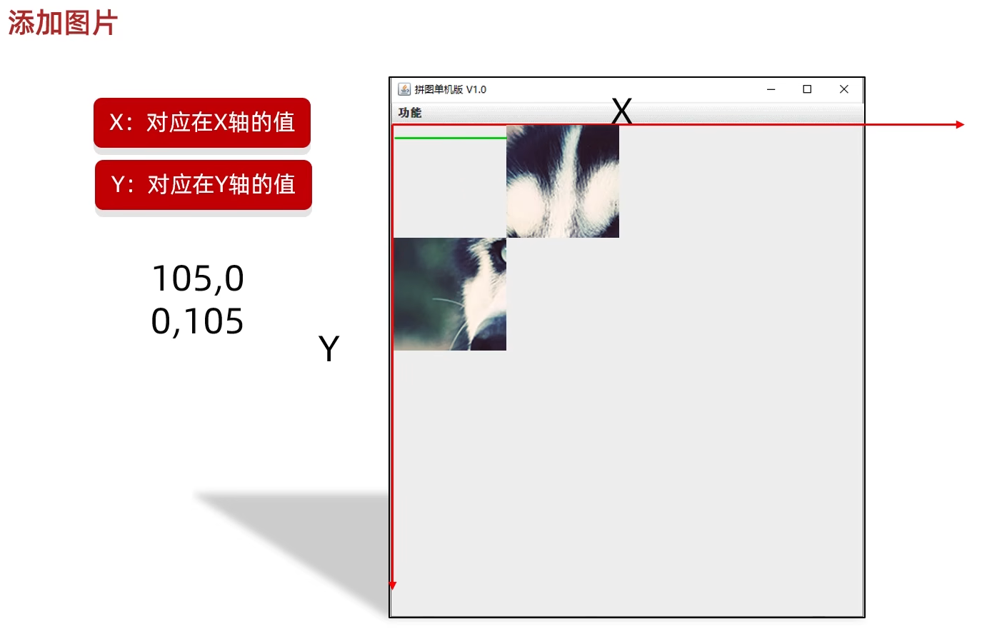 但有一个问题:图片会被默认添加到中间的位置,那当我们添加多张图片时,它们就会重叠在一起,达不到我们想要的效果,因此引入了坐标的概念,来确定图片的位置: