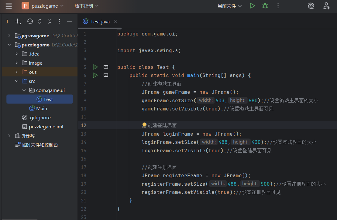 package com.game.ui;import javax.swing.*;public class GameJFrame extends JFrame {//JFrame表示界面、窗体,它的子类也表示界面、窗体//GameJFrame这个界面表示游戏的主界面//跟游戏相关的所有逻辑都写在这个类中//创建游戏主界面//构造方法:作用是创建对象时调用,名称必须和类名相同没有返回值类型public GameJFrame() {//初始化游戏主界面initJFrame();//初始化菜单initJMenuBar();//让游戏主界面显示出来this.setVisible(true);}//初始化菜单private void initJMenuBar() {//创建整个菜单对象JMenuBarJMenuBar jMenuBar = new JMenuBar();//创建菜单上面的两个选项的对象 - 功能、关于我们JMenu FunctionJMenu = new JMenu("功能");JMenu AboutJMenu = new JMenu("关于我们");//创建每个选项对应的条目的对象 - 重新游戏、重新登陆、关闭游戏;说明JMenuItem replayJMenuItem = new JMenuItem("重新游戏");JMenuItem reLoginJMenuItem = new JMenuItem("重新登录");JMenuItem closeJMenuItem = new JMenuItem("关闭游戏");JMenuItem aboutJMenuItem = new JMenuItem("说明");//将每个选项对应的条目添加到对应的选项中FunctionJMenu.add(replayJMenuItem);FunctionJMenu.add(reLoginJMenuItem);FunctionJMenu.add(closeJMenuItem);AboutJMenu.add(aboutJMenuItem);//将选项添加到菜单中jMenuBar.add(FunctionJMenu);jMenuBar.add(AboutJMenu);//将菜单添加到界面中this.setJMenuBar(jMenuBar);}//初始化游戏主界面private void initJFrame() {//设置界面宽高this.setSize(603, 680);//设置界面标题this.setTitle("拼图小游戏");//设置界面置顶this.setAlwaysOnTop(true);//设置界面居中this.setLocationRelativeTo(null);//设置关闭模式this.setDefaultCloseOperation(WindowConstants.EXIT_ON_CLOSE);}