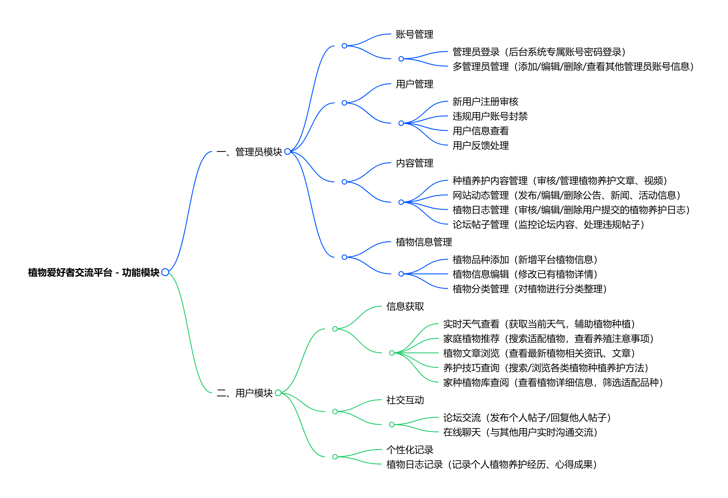 植物爱好者交流平台围绕管理员与用户两大角色设计功能,具体如下: