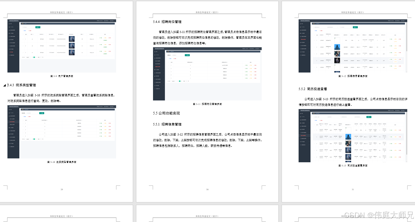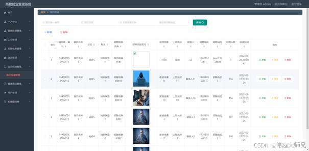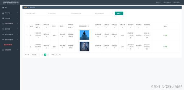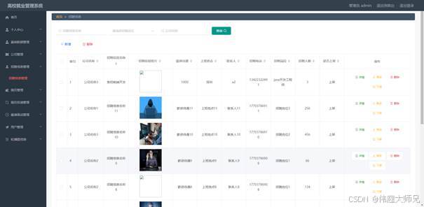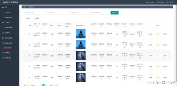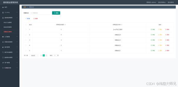 管理员进入如图5-11所示的招聘岗位管理界面之后,管理员点击信息显示栏中最右侧的修改,删除按钮可依次完成招聘岗位信息的修改,删除操作,管理员在本界面也能查询招聘岗位信息,添加招聘岗位信息等。