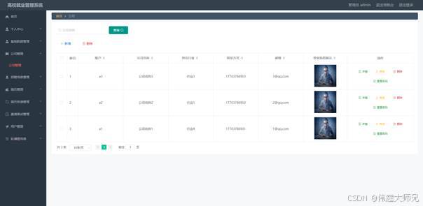 管理员进入如图5-8所示的公司管理界面之后,管理员点击信息显示栏中最右侧的修改,删除,重置密码按钮可依次完成公司信息的修改,删除,密码重置等操作,管理员也能在当前界面查询公司信息,添加公司信息等。
