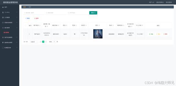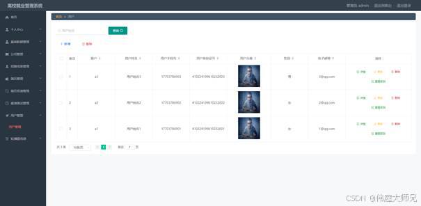 管理员进入如图5-9所示的用户管理界面之后,管理员点击信息显示栏中最右侧的修改,删除按钮可依次完成用户信息的修改,删除等操作,管理员在当前界面也能添加用户,查询用户。