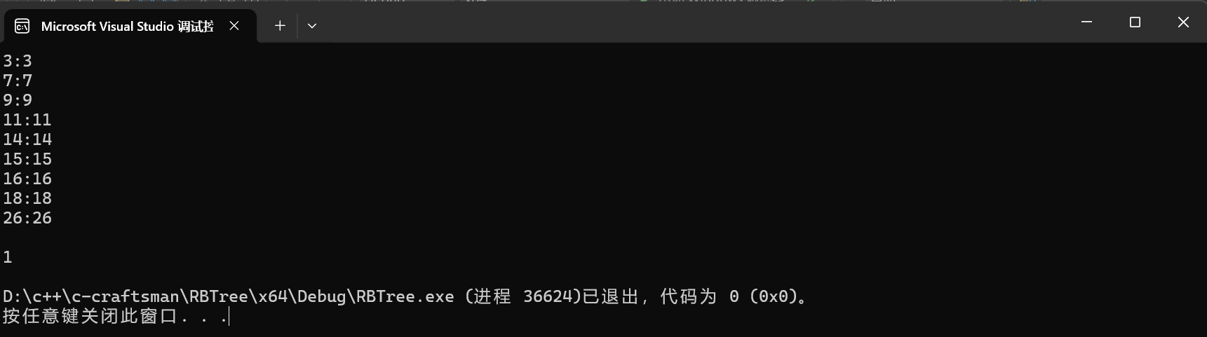 {RBTree<int, int> t;// 常规的测试⽤例int a[] = { 16, 3, 7, 11, 9, 26, 18, 14, 15 };// 特殊的带有双旋场景的测试⽤例//int a[] = { 4, 2, 6, 1, 3, 5, 15, 7, 16, 14 };for (auto e : a){t.Insert({ e, e });}t.InOrder();cout << t.CheckColour() << endl;