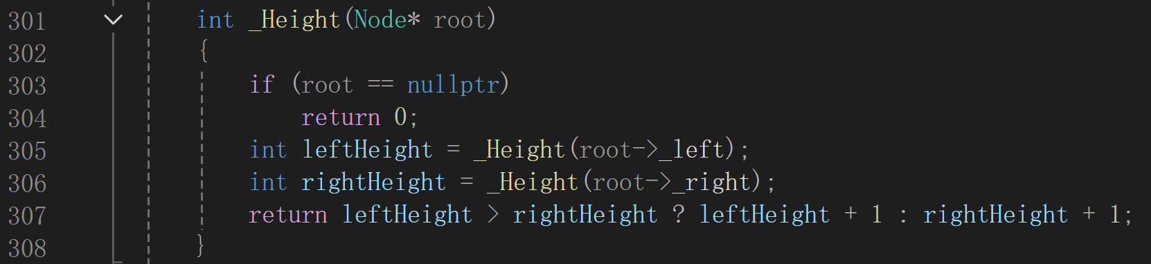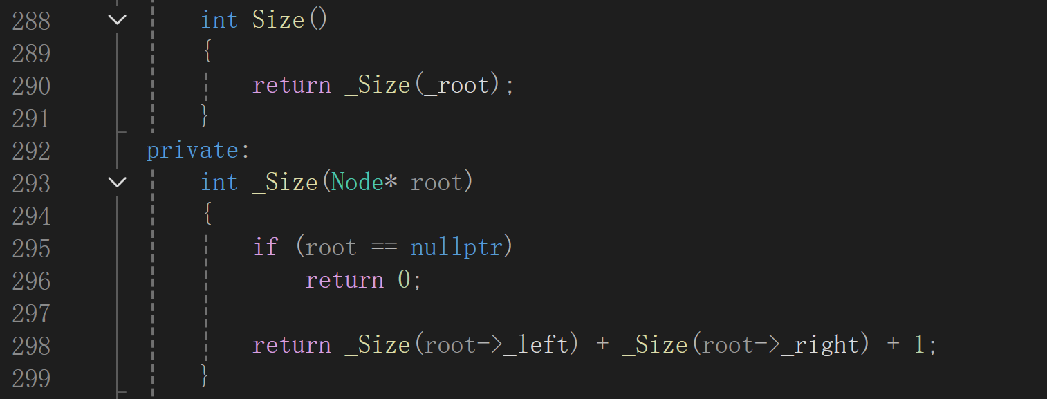 private:int _Size(Node* root) { if (root == nullptr) return 0;return _Size(root->_left) + _Size(root->_right) + 1; // 递归调用}