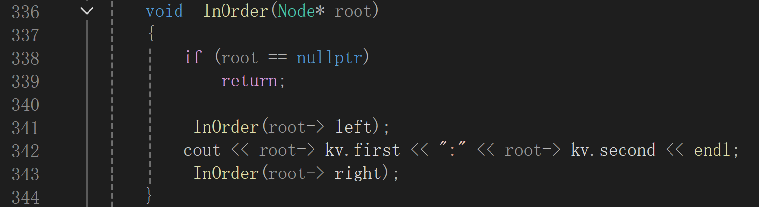 {Node* cur = _root;while (cur){if (cur->_kv.first < key){cur = cur->_right;}else if (cur->_kv.first > key){cur = cur->_left;}else{return cur;}}