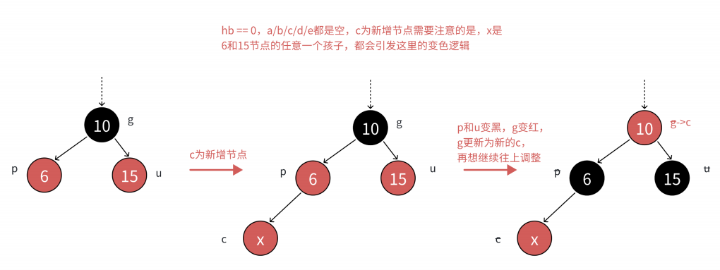 c 为红,p 为红,g 为黑,u 不存在或者 u 存在且为黑,u 不存在,则 c 一定是新增结点,u 存在且为黑,则 c 一定不是新增,c 之前是黑色的,是在 c 的子树中插入,符合情况 1,变色将 c 从黑色变成红色,更新上来的