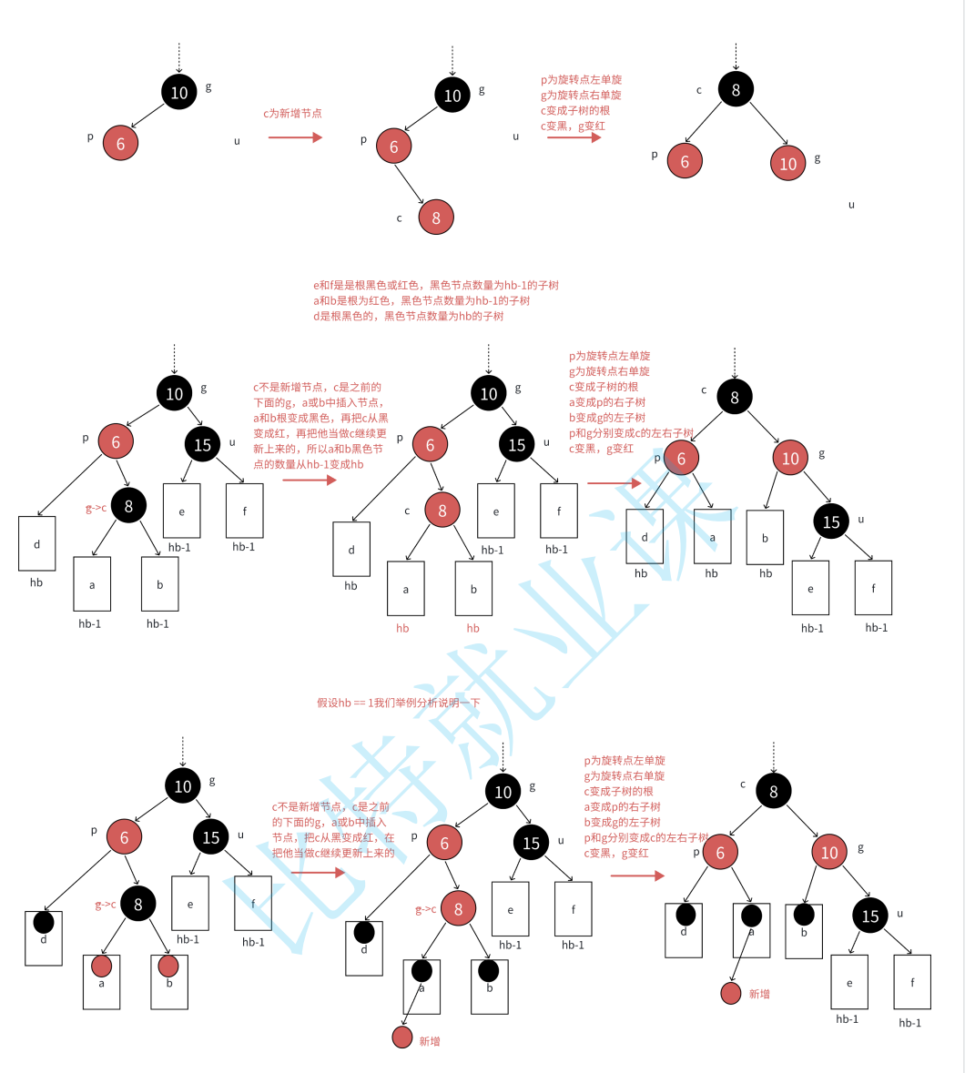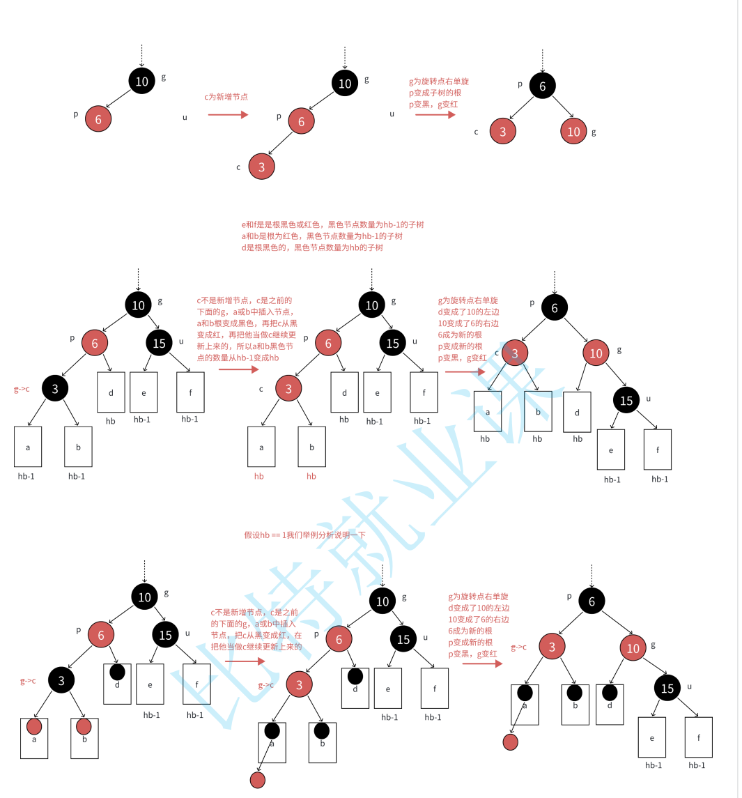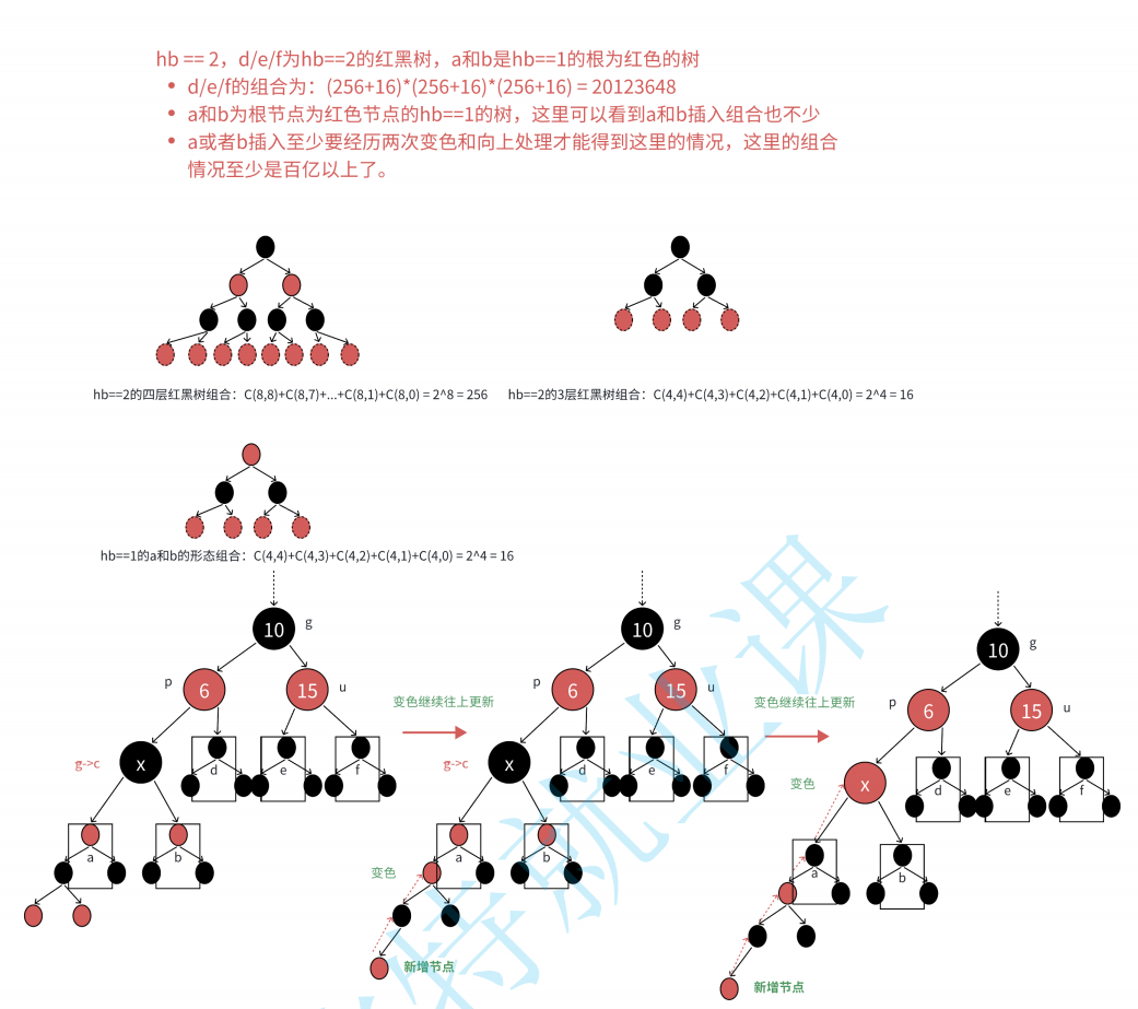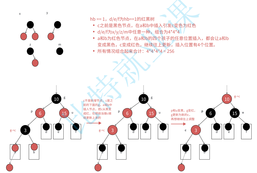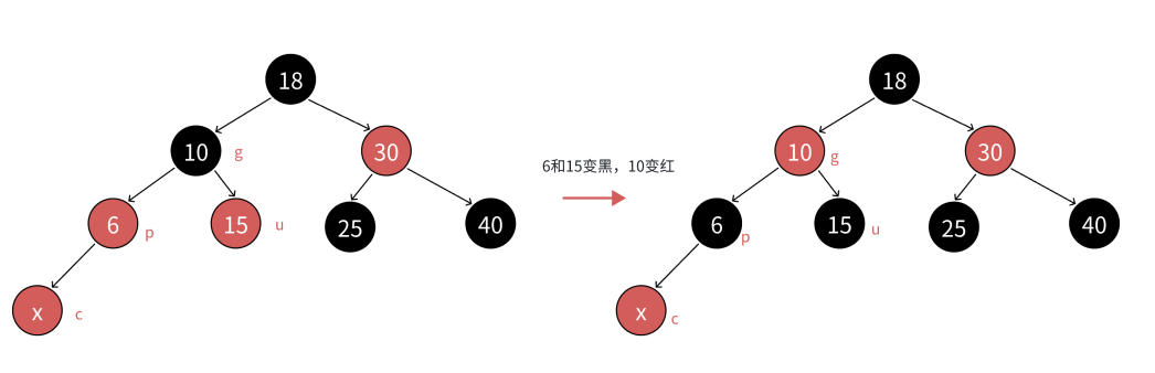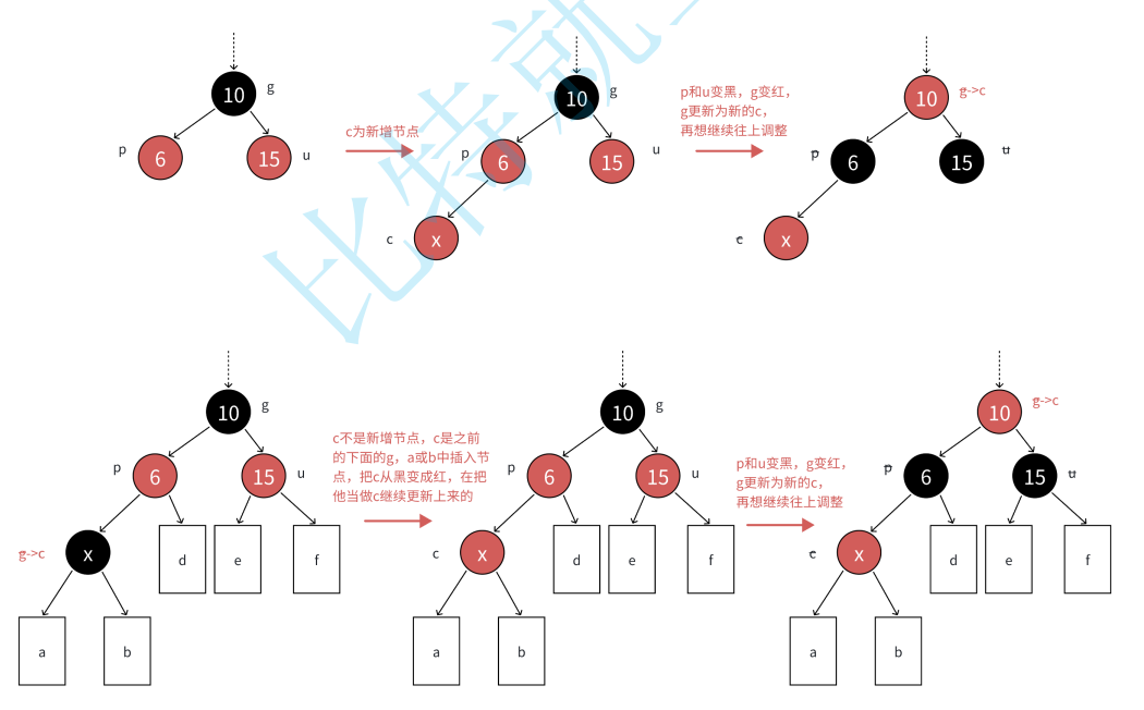 c 为红,p 为红,g 为黑,u 存在且为红,则将 p 和 u 变黑,g 变红。在把 g 当做新的 c,继续往上更新。