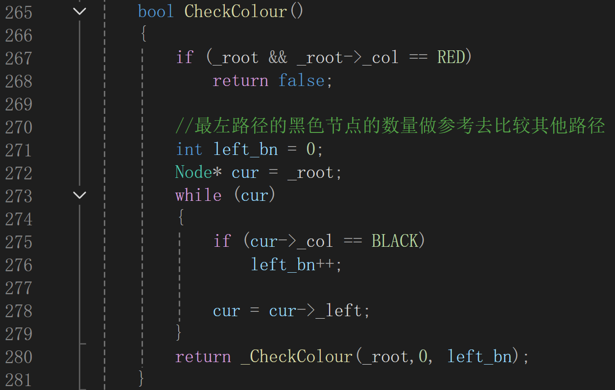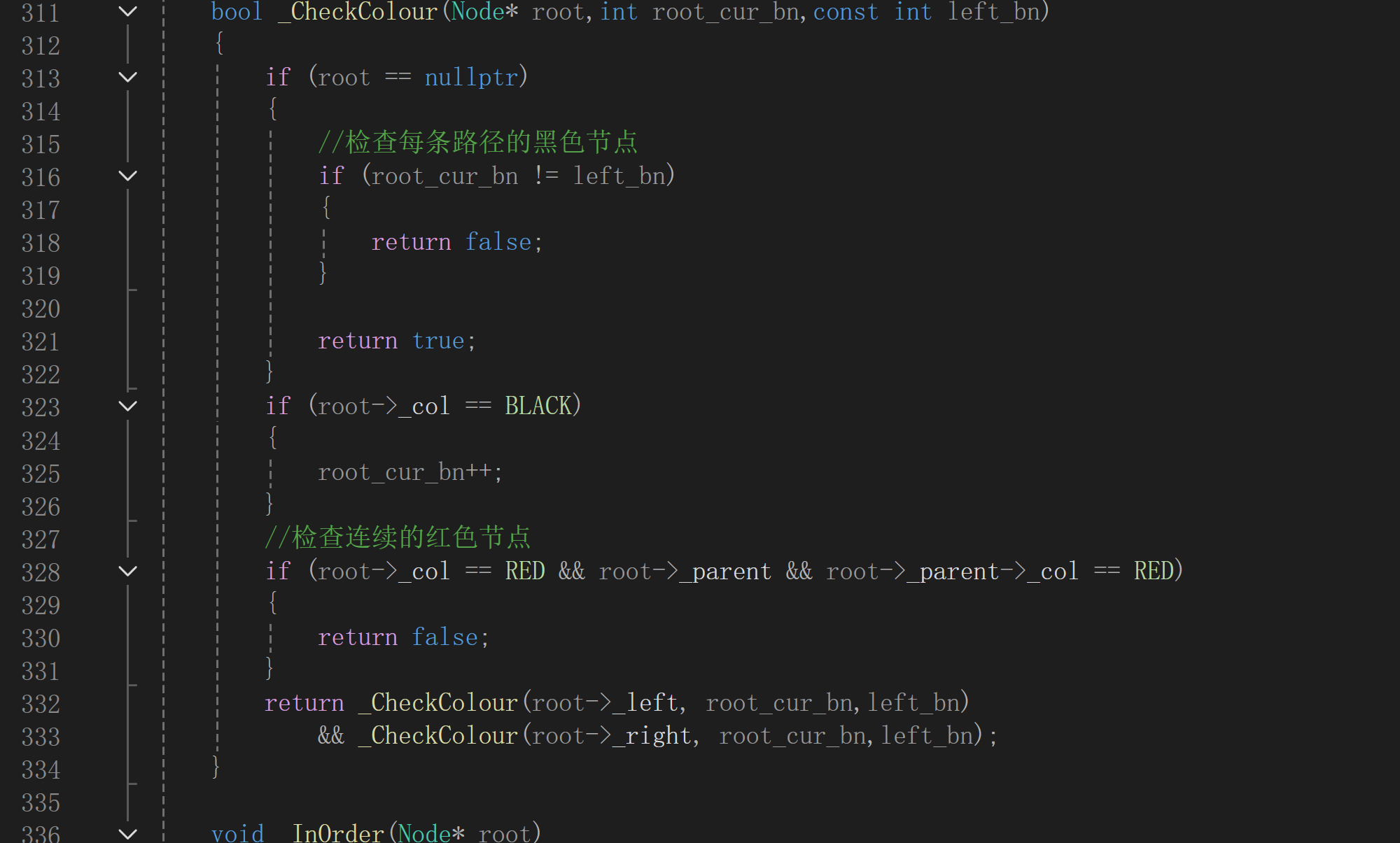 private:int _Size(Node* root){if (root == nullptr)return 0;return _Size(root->_left) + _Size(root->_right) + 1;}int _Height(Node* root){if (root == nullptr)return 0;int leftHeight = _Height(root->_left);int rightHeight = _Height(root->_right);return leftHeight > rightHeight ? leftHeight + 1 : rightHeight + 1;}//root_cur_bn从根节点到当前节点路径上黑色节点的数量//前序递归bool _CheckColour(Node* root,int root_cur_bn,const int left_bn){if (root == nullptr){//检查每条路径的黑色节点if (root_cur_bn != left_bn){return false;}return true;}if (root->_col == BLACK){root_cur_bn++; }//检查连续的红色节点if (root->_col == RED && root->_parent && root->_parent->_col == RED){return false;}return _CheckColour(root->_left, root_cur_bn,left_bn)&& _CheckColour(root->_right, root_cur_bn,left_bn);}void _InOrder(Node* root){if (root == nullptr)return;_InOrder(root->_left);cout << root->_kv.first << ":" << root->_kv.second << endl;_InOrder(root->_right);}private:Node* _root = nullptr;