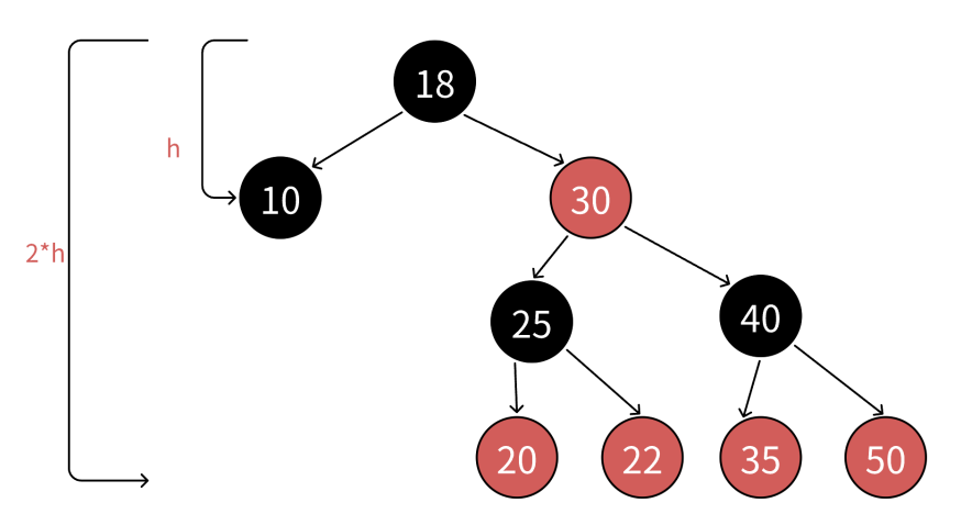 - 由规则 2 和规则 3 可知,任意一条路径不会有连续的红色结点,所以极端场景下,最长的路径就是一黑一红间隔组成,那么最长路径的长度为 2*bh