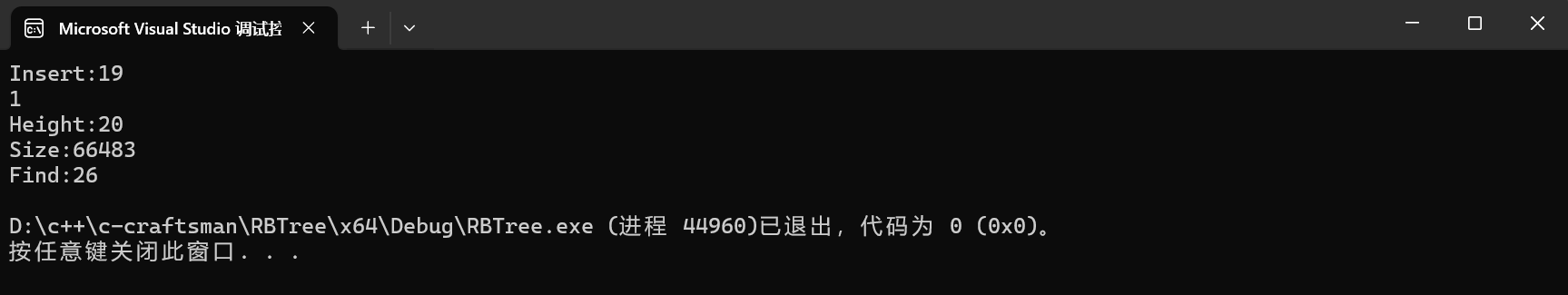 {const int N = 100000;vector<int> v;v.reserve(N);srand(time(0));for (size_t i = 0; i < N; i++){v.push_back(rand() + i);}size_t begin2 = clock();RBTree<int, int> t;for (auto e : v){t.Insert(make_pair(e, e));}size_t end2 = clock();cout << "Insert:" << end2 - begin2 << endl;cout << t.CheckColour() << endl;cout << "Height:" << t.Height() << endl;cout << "Size:" << t.Size() << endl;size_t begin1 = clock();// 确定在的值for (auto e : v){t.Find(e);}// 随机值for (size_t i = 0; i < N; i++){t.Find((rand() + i));}size_t end1 = clock();cout << "Find:" << end1 - begin1 << endl;