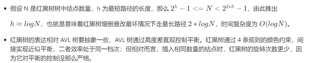 - 综合红黑树的 4 点规则而言,理论上的全黑最短路径和一黑一红的最长路径并不是在每棵红黑树都存在的。假设任意一条从根到 NULL 结点路径的长度为 x,那么 bh <= h <= 2*bh