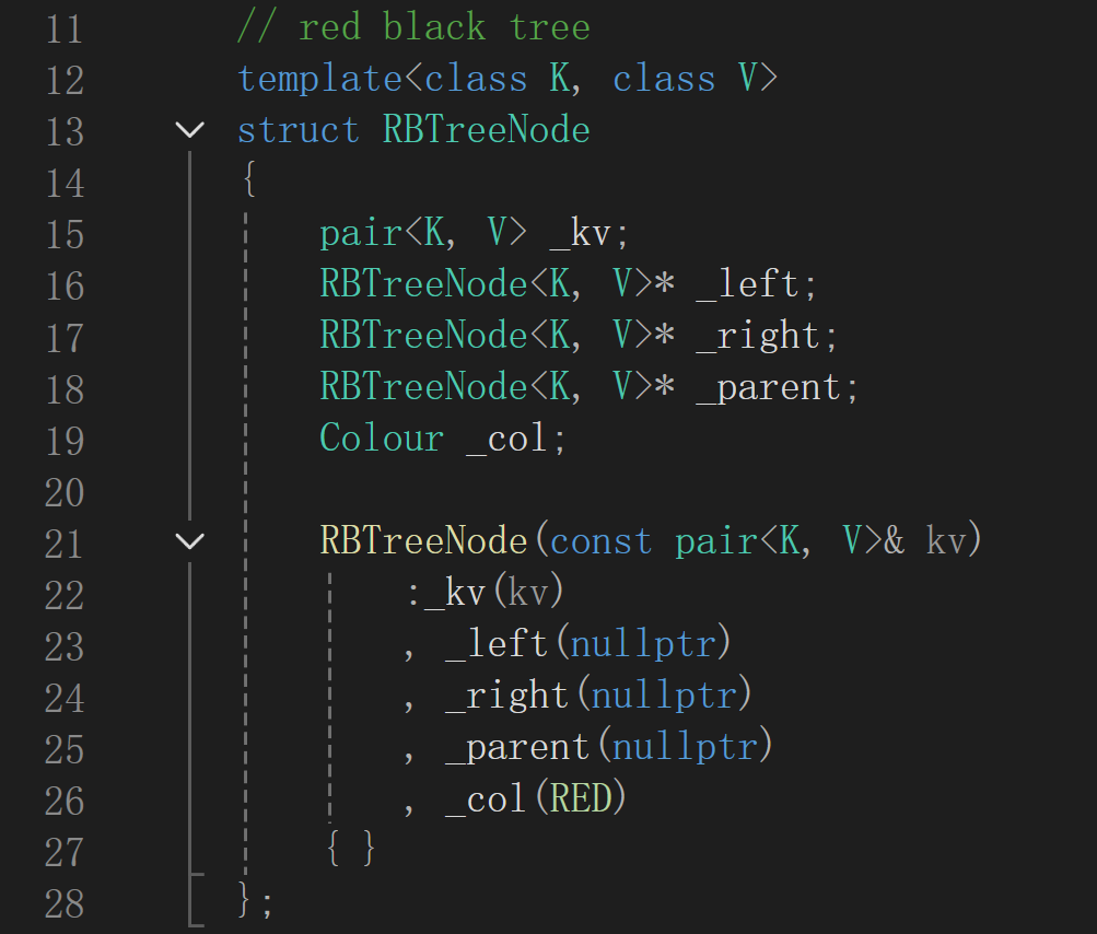 {pair<K, V> _kv;RBTreeNode<K, V>* _left;RBTreeNode<K, V>* _right;RBTreeNode<K, V>* _parent;Colour _col;RBTreeNode(const pair<K, V>& kv):_kv(kv), _left(nullptr), _right(nullptr), _parent(nullptr), _col(RED){ }
