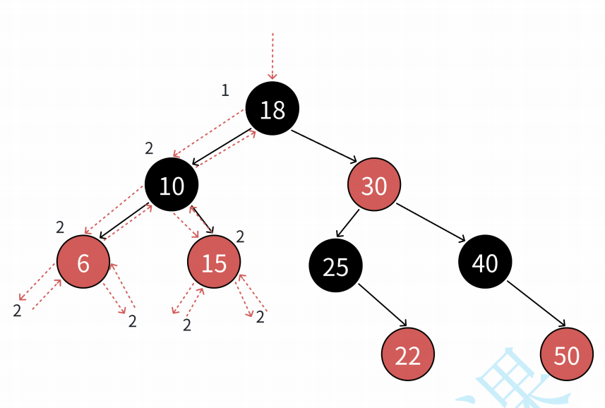 - 规则 4 前序遍历,遍历过程中用形参记录跟到当前结点的 blackNum (黑色结点数量),前序遍历遇到黑色结点就 ++blackNum,走到空就计算出了一条路径的黑色结点数量。再任意一条路径黑色结点数量作为参考值,依次比较即可。