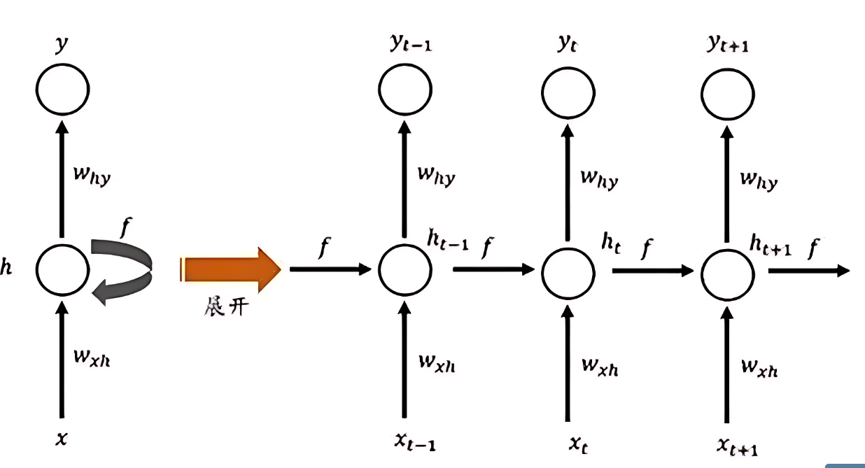 `W_{xh}`, `W_{hh}`, `W_{hy}`: 分别是输入到隐藏层、隐藏层到隐藏层、隐藏层到输出层的权重矩阵。这些权重在所有时间步中是共享的。
