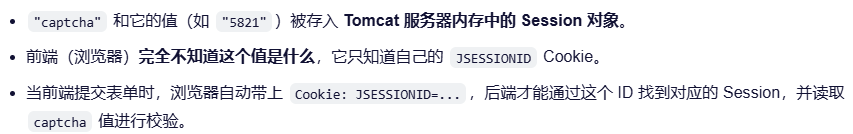 - Session 是服务器为每个用户创建的一个会话对象,用于在多次 HTTP 请求之间保存用户的状态信息(比如登录状态、验证码、购物车等)。