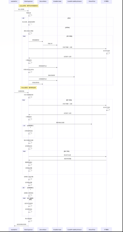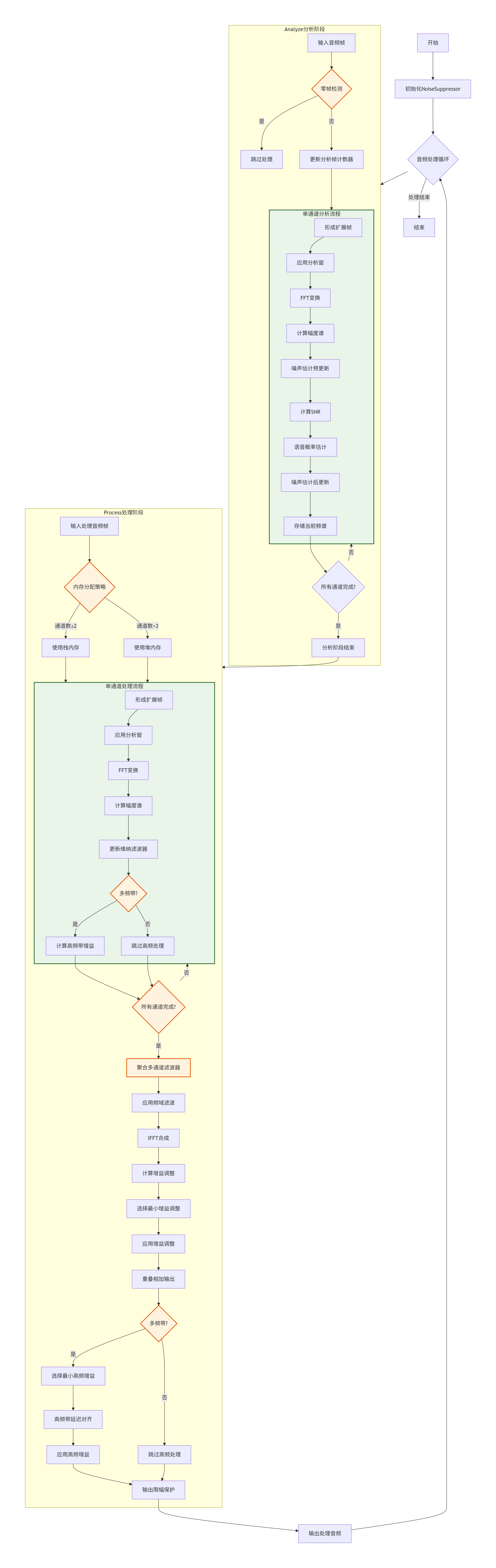 void NoiseSuppressor::Analyze(const AudioBuffer& audio) {// 准备噪声估计器进行分析阶段for (size_t ch = 0; ch < num_channels_; ++ch) {channels_[ch]->noise_estimator.PrepareAnalysis();}// 零帧检测:避免在无声时更新统计信息bool zero_frame = true;for (size_t ch = 0; ch < num_channels_; ++ch) {rtc::ArrayView<const float, kNsFrameSize> y_band0(&audio.split_bands_const(ch)[0][0], kNsFrameSize);float energy = ComputeEnergyOfExtendedFrame(y_band0, channels_[ch]->analyze_analysis_memory);if (energy > 0.f) {zero_frame = false;break;}}if (zero_frame) return; // 跳过零帧处理// 分析计数器更新if (++num_analyzed_frames_ < 0) {num_analyzed_frames_ = 0;}// 多通道分析处理for (size_t ch = 0; ch < num_channels_; ++ch) {// 形成扩展帧并应用滤波器组窗std::array<float, kFftSize> extended_frame;FormExtendedFrame(y_band0, ch_p->analyze_analysis_memory, extended_frame);ApplyFilterBankWindow(extended_frame);// FFT变换和幅度谱计算std::array<float, kFftSize> real;std::array<float, kFftSize> imag;fft_.Fft(extended_frame, real, imag);std::array<float, kFftSizeBy2Plus1> signal_spectrum;ComputeMagnitudeSpectrum(real, imag, signal_spectrum);// 噪声和语音概率估计ch_p->noise_estimator.PreUpdate(num_analyzed_frames_, signal_spectrum,signal_spectral_sum);// SNR计算和语音概率更新ComputeSnr(ch_p->wiener_filter.get_filter(),ch_p->prev_analysis_signal_spectrum, signal_spectrum,ch_p->noise_estimator.get_prev_noise_spectrum(),ch_p->noise_estimator.get_noise_spectrum(), prior_snr, post_snr);ch_p->noise_estimator.PostUpdate(ch_p->speech_probability_estimator.get_probability(), signal_spectrum);// 存储当前幅度谱供处理阶段使用std::copy(signal_spectrum.begin(), signal_spectrum.end(),ch_p->prev_analysis_signal_spectrum.begin());}