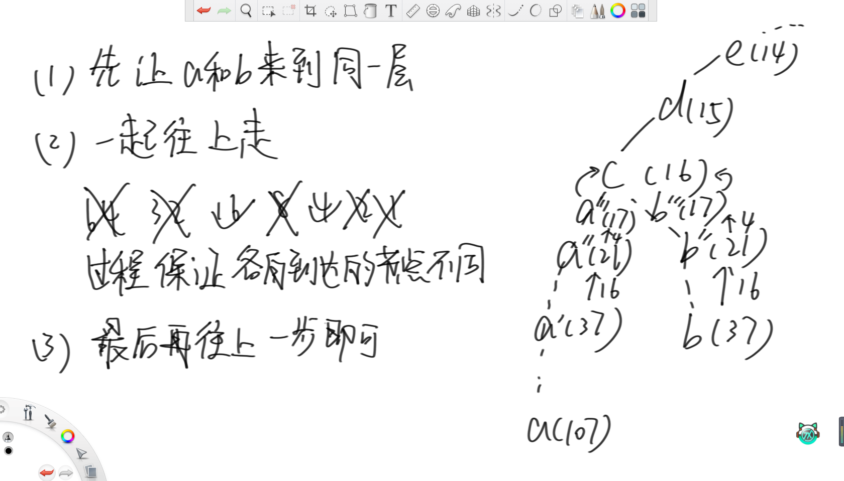 一开始还是正常构建stjump表,之后对于查询,为了方便写代码,所以考虑让a节点固定是最深的节点。之后从高位到低位考虑,只要往上跳后层数还大于等于b节点,就往上跳即可。此时特判一下,若a已经等于b了,那么就直接返回即可。之后就是让a和b同时往上跳,最后再多跳一步即可。