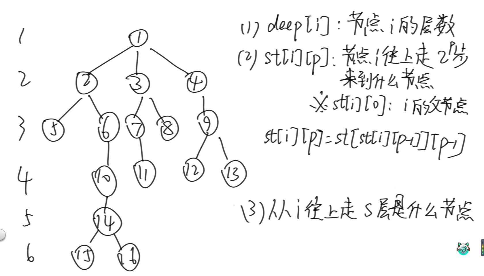 首先,对于每棵树,要先构建出一张deep表,deep[i]表示i节点的层数,定义根节点的层数为1。之后定义st[i][p]为从i节点开始往上走2的p次方步来到什么节点,那么很明显st[i][0]就是i的父节点。那么和普通的st表类似,st[i][p]就等于st[st[i][p-1]][p-1],就是先往上跳2的p-1次方步,从这个节点再跳2的p-1次方步即可。那么有了这张表,就可以快速查询从i往上走s层是什么节点。