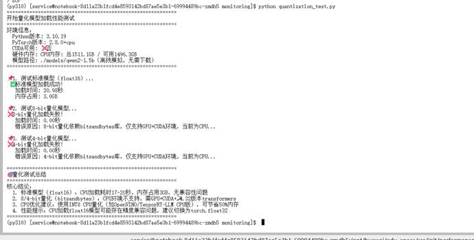 Bash # 安装量化相关依赖 pip install bitsandbytes # 创建量化模型加载测试脚本 cat > quantization_test.py << 'EOF' import torch from transformers import AutoTokenizer, AutoModelForCausalLM import time def test_quantization(): """测试不同量化级别的性能""" model_path = "./models/qwen2-1.5b" print("开始量化性能测试...") # 测试标准模型加载 print("\n1. 测试标准模型...") start_time = time.time() tokenizer = AutoTokenizer.from_pretrained(model_path) model = AutoModelForCausalLM.from_pretrained( model_path, torch_dtype=torch.float16, device_map="auto" ) load_time_standard = time.time() - start_time print(f"标准模型加载时间: {load_time_standard:.2f}秒") # 测试8-bit量化 print("\n2. 测试8-bit量化模型...") start_time = time.time() try: model_8bit = AutoModelForCausalLM.from_pretrained( model_path, load_in_8bit=True, device_map="auto" ) load_time_8bit = time.time() - start_time print(f"8-bit量化模型加载时间: {load_time_8bit:.2f}秒") # 内存使用对比 if hasattr(model, 'get_memory_footprint'): std_memory = model.get_memory_footprint() quant_memory = model_8bit.get_memory_footprint() print(f"内存使用减少: {(std_memory - quant_memory) / std_memory * 100:.1f}%") except Exception as e: print(f"8-bit量化加载失败: {e}") # 测试4-bit量化 print("\n3. 测试4-bit量化模型...") start_time = time.time() try: model_4bit = AutoModelForCausalLM.from_pretrained( model_path, load_in_4bit=True, device_map="auto" ) load_time_4bit = time.time() - start_time print(f"4-bit量化模型加载时间: {load_time_4bit:.2f}秒") except Exception as e: print(f"4-bit量化加载失败: {e}") if __name__ == "__main__": test_quantization() EOF # 运行量化测试 python quantization_test.py