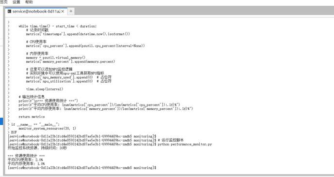Bash # 创建监控脚本目录 mkdir -p monitoring cd monitoring cat > performance_monitor.py << 'EOF' import psutil import time import json from datetime import datetime def monitor_system_resources(duration=60, interval=1): """监控系统资源使用情况""" print(f"开始监控系统资源,持续时间: {duration}秒") metrics = { 'timestamps': [], 'cpu_percent': [], 'memory_percent': [], 'npu_memory_used': [], 'npu_utilization': [] } start_time = time.time() while time.time() - start_time < duration: # 记录时间戳 metrics['timestamps'].append(datetime.now().isoformat()) # CPU使用率 metrics['cpu_percent'].append(psutil.cpu_percent(interval=None)) # 内存使用率 memory = psutil.virtual_memory() metrics['memory_percent'].append(memory.percent) # 这里可以添加NPU监控逻辑 # 实际环境中可以使用npu-smi工具获取NPU指标 metrics['npu_memory_used'].append(0) # 占位符 metrics['npu_utilization'].append(0) # 占位符 time.sleep(interval) # 输出统计信息 print(f"\n=== 资源使用统计 ===") print(f"平均CPU使用率: {sum(metrics['cpu_percent'])/len(metrics['cpu_percent']):.1f}%") print(f"平均内存使用率: {sum(metrics['memory_percent'])/len(metrics['memory_percent']):.1f}%") return metrics if __name__ == "__main__": monitor_system_resources(30, 1) EOF # 运行监控脚本 python performance_monitor.py