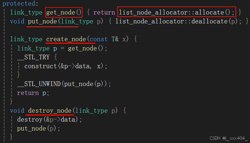 总结上述代码,get_node()为获取一个结点,put_node()是释放结点,create_node为初始化,其中的construct是调定位new,不过我们模拟实现只需要new/delete即可。