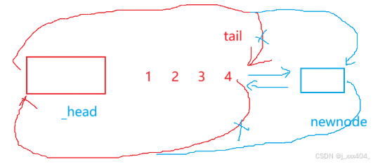 {Node* newnode = new Node(x);Node* tail = _head->_prev;tail->_next = newnode;newnode->_prev = tail;newnode->_next = _head;_head->_prev = newnode;