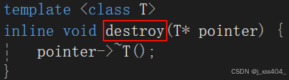 destroy()对应的析构,此处析构的意义举例:在list中定义了string,如:list<string>lt,那么在析构时不能只调用其自己的结点,也需要对string析构。并且在C++中,可以认为内置类型也有构造和析构,因为这里的T可以是基本类型也可以是类类型等。