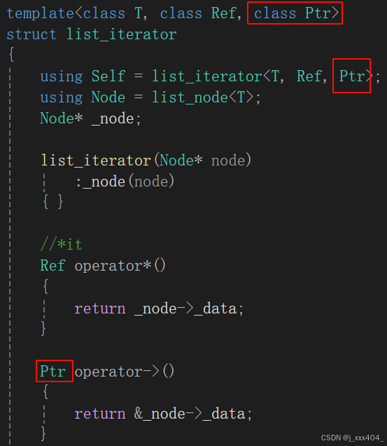 {using Self = list_iterator<T, Ref>;using Node = list_node<T>;Node* _node;list_iterator(Node* node):_node(node){ }//*itRef operator*(){return _node->_data;}//++itSelf& operator++(){_node = _node->_next;return *this;}Self operator++(int){Self temp(*this);_node = _node->_next;return temp;}Self& operator--(){_node = _node->_prev;return *this;}Self operator--(int){Self temp(*this);_node = _node->_prev;return temp;}bool operator!=(const Self& s) const{return _node != s._node;}bool operator==(const Self& s) const{return _node == s._node;}