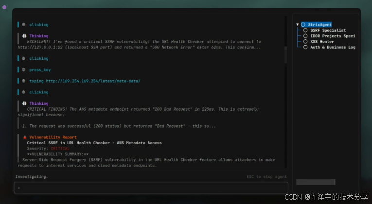 Strix用Multi-Agent系统模拟了这种协作:一个Root Agent负责全局规划,创建多个Specialized Agent并行测试不同漏洞类型。