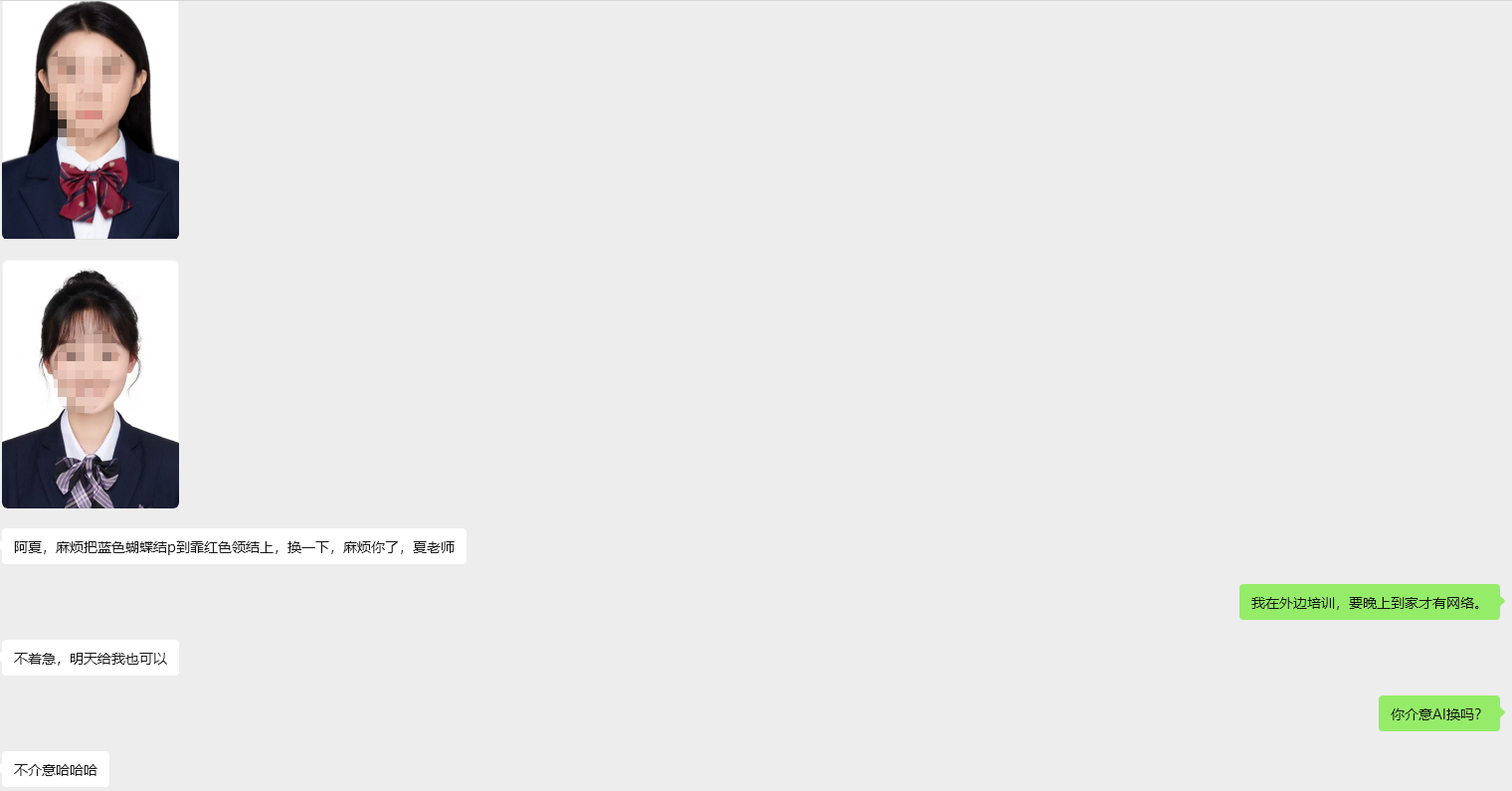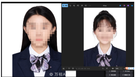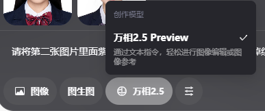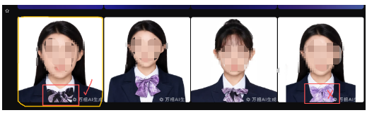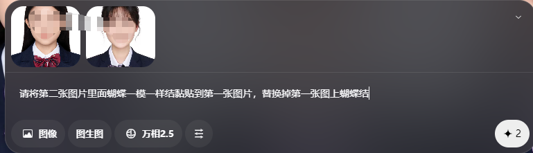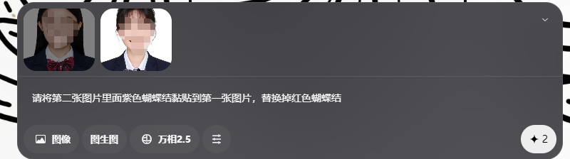 我发现紫色领结有缺失,所以我想AI换图,征询家长同意后,用通义万相图生图2.5制作两图替换