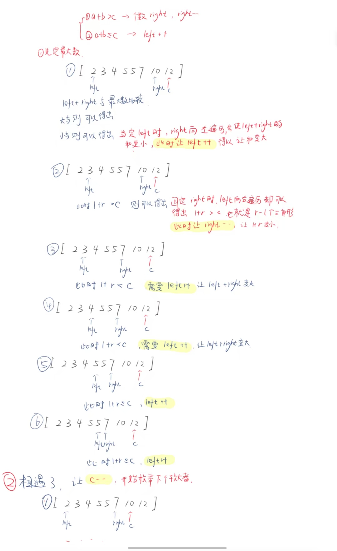 - 排序:先对数组排序(升序),方便固定最长边并利用双指针寻找有效组合。