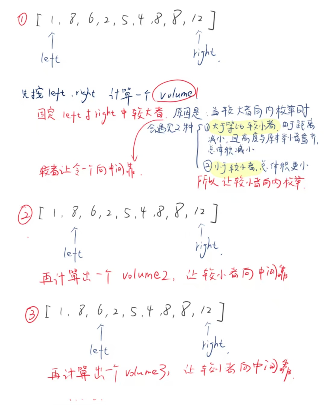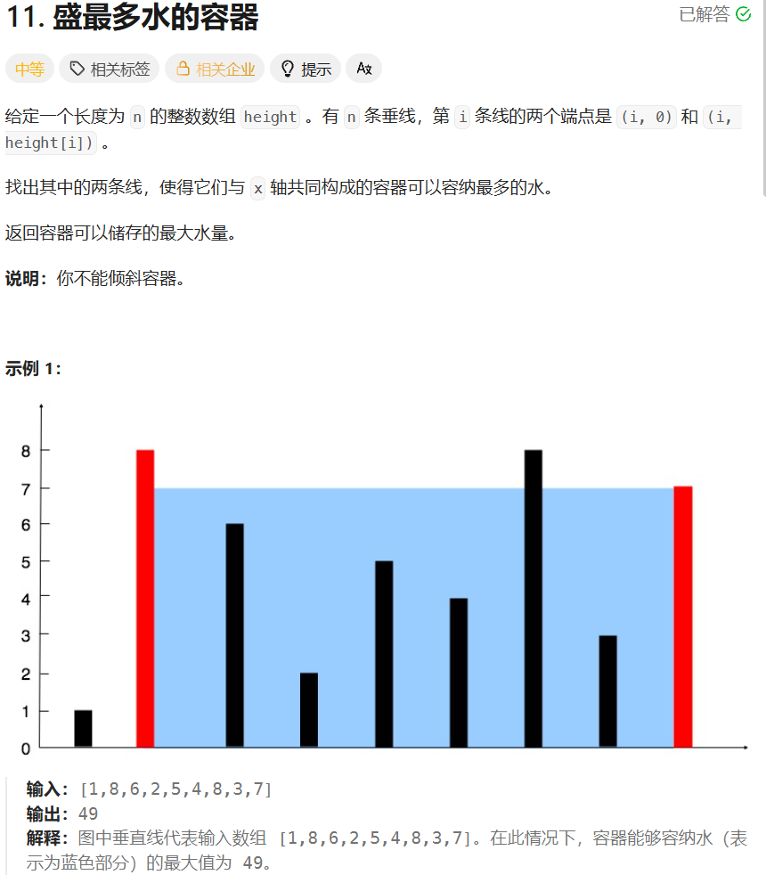 left在数组起始位置(0),右指针right在数组末尾(height.length-1),此时两指针距离最大。 - 计算当前面积:以两指针距离为底,较短的垂线高度为高,乘积为当前面积。