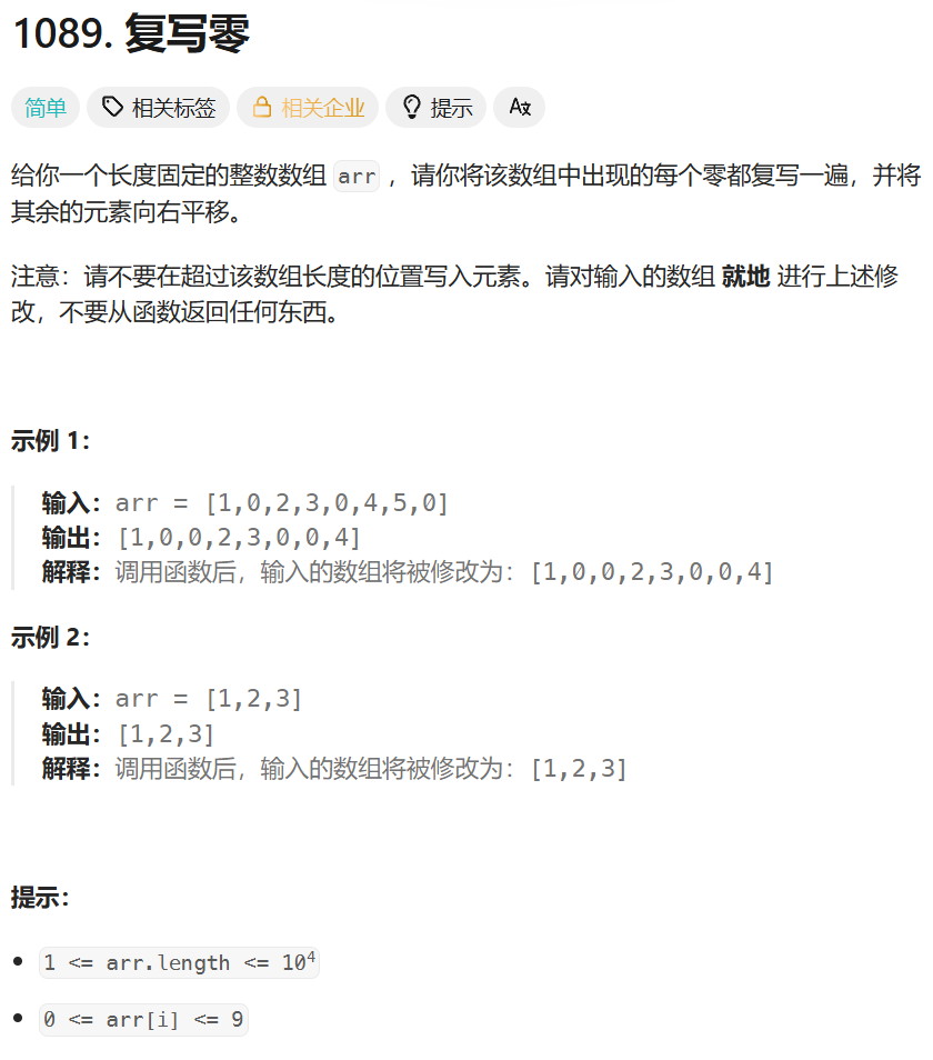 class Solution {public void duplicateZeros(int[] arr) {int count = 0;int len = arr.length;int cur = 0;for(cur = 0;cur<=len-1;cur++){if(count>=len){break;}if(arr[cur] == 0){count+=2;}else{count++;}}int dest = len-1;cur--;if(count == len+1){arr[dest--] = 0;cur--;}while(cur>=0&&dest>=0){if(arr[cur]!=0){arr[dest--] = arr[cur--];}else{arr[dest--] = 0;arr[dest--] = 0;cur--;}}}
