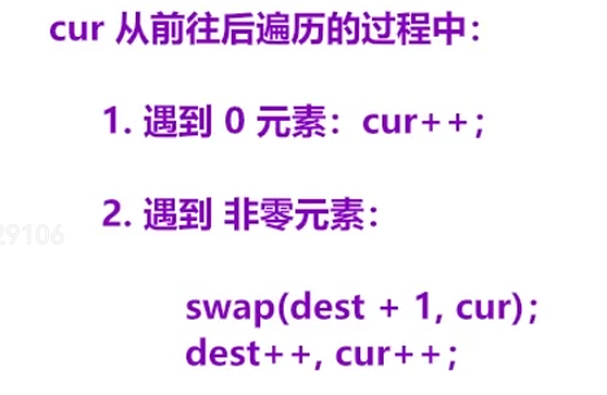 public void moveZeroes2(int[] nums){for(int cur = 0,dest = -1;cur < nums.length;cur++){if(nums[cur]!=0) {dest++;swap(nums, dest, cur);}}