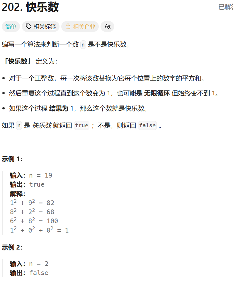 class Solution {public static boolean isHappy(int n) {if(n == 1||sum_squares(n) == 1){return true;}int slow = sum_squares(n);int fast = sum_squares(sum_squares(n));while(slow != fast){slow = sum_squares(slow);fast = sum_squares(sum_squares(fast));if(slow == 1||fast == 1){return true;}}return false;}public static int sum_squares(int n){int sum = 0;while(n!=0){int tmp = n % 10;sum = sum + tmp*tmp;n /= 10;}return sum;}