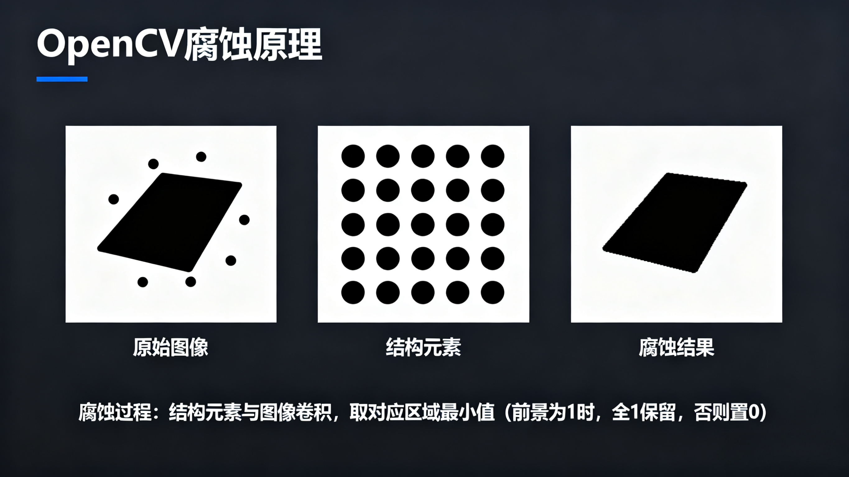 腐蚀是图像形态学处理的基本操作之一,它与膨胀互为逆运算。膨胀使图像区域扩大,而腐蚀则使图像区域缩小。腐蚀操作的核心是定义一个卷积核,通过计算原图像与卷积核的局部最小值来生成新的图像。如图1所示,其数学表达式为:dst(x,y) = erode(src(x,y)) = min(x,y)src(x+x,y+y)。图2展示了经过erode处理前后图像的对比效果。