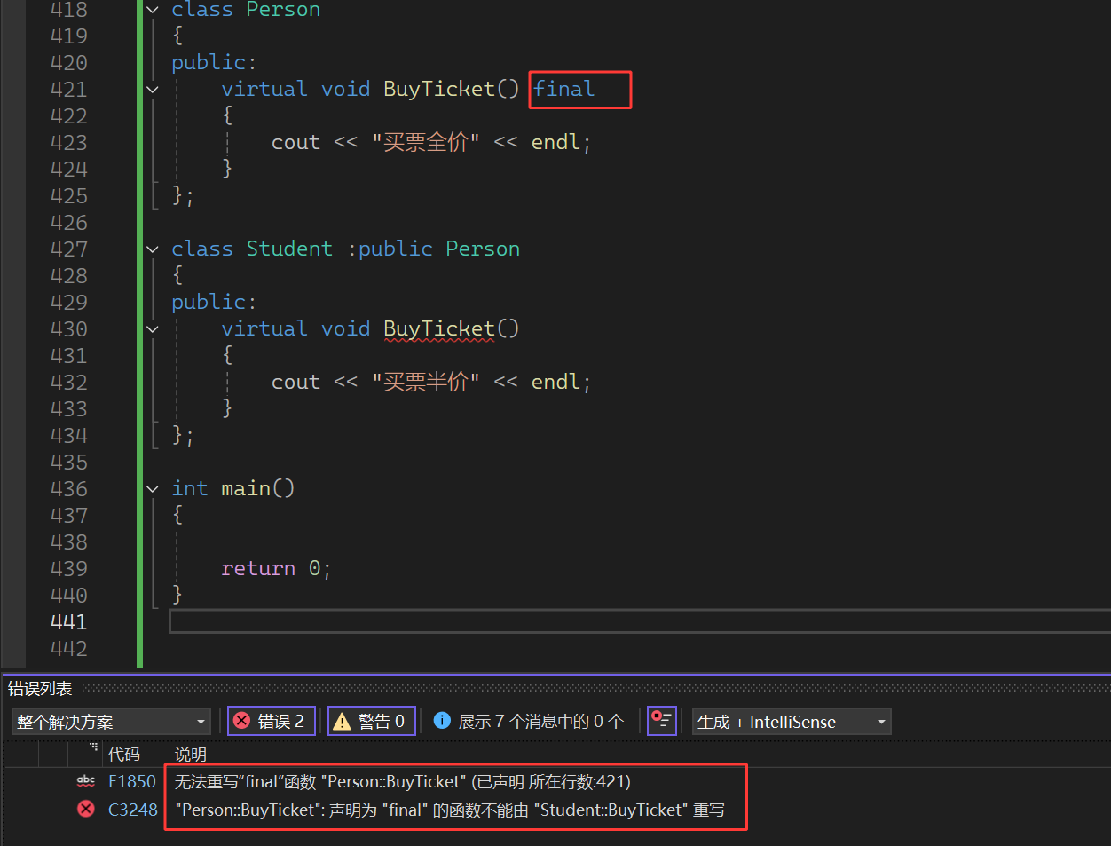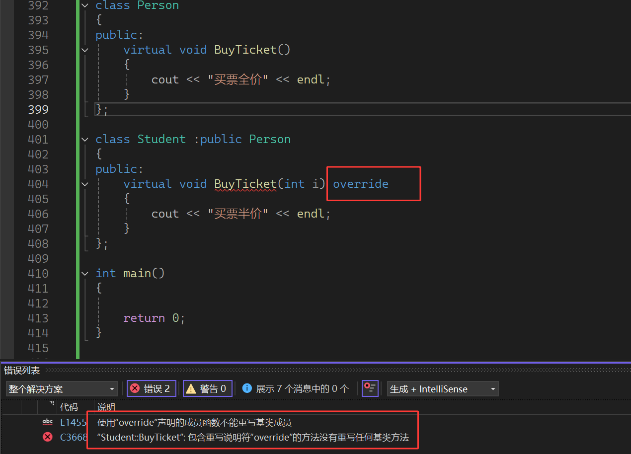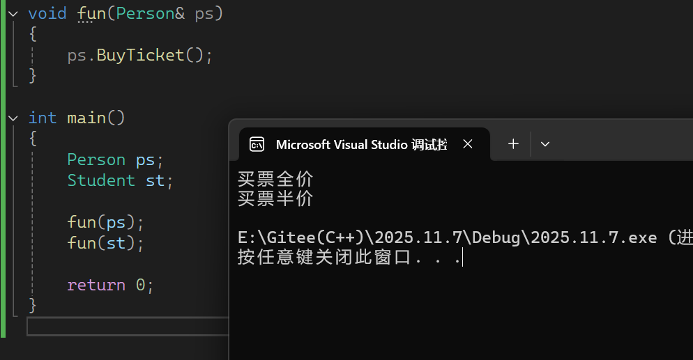 - 通过基类引用( Person& )(构成多态的第一个条件) 调用函数时,会根据实际传入的对象( Person 或 Student ) (派生类对象可以隐式转换为基类的指针/引用),自动调用对应类的 BuyTicket ,最终输出“买票全价”和“买票半价”。