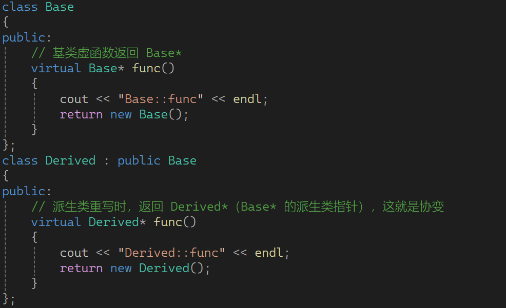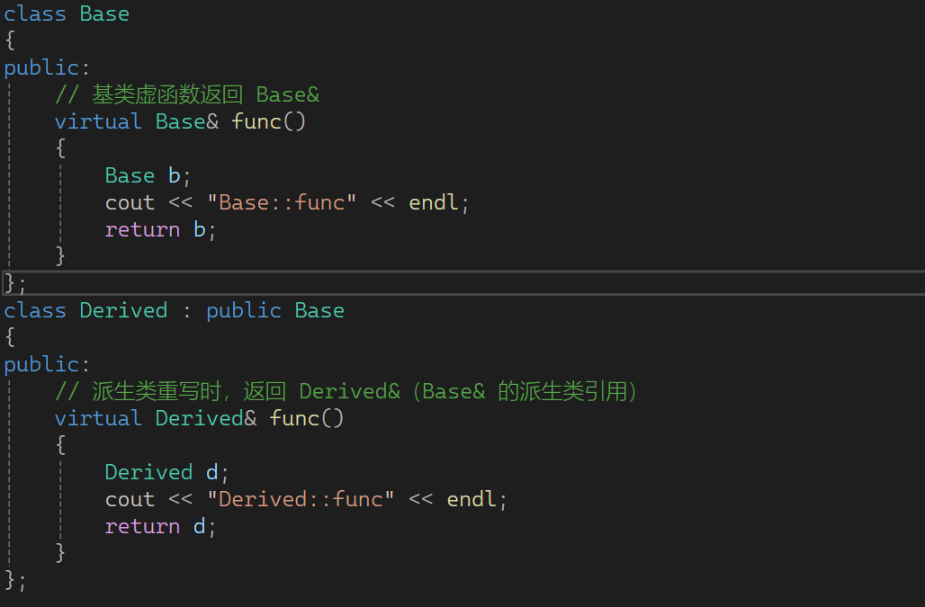 具体来说,当基类虚函数的返回值是基类的指针(或引用)时,派生类重写该虚函数时,返回值可以是派生类的指针(或引用)——这就是协变,属于合法的虚函数重写。
