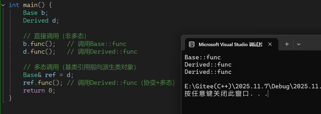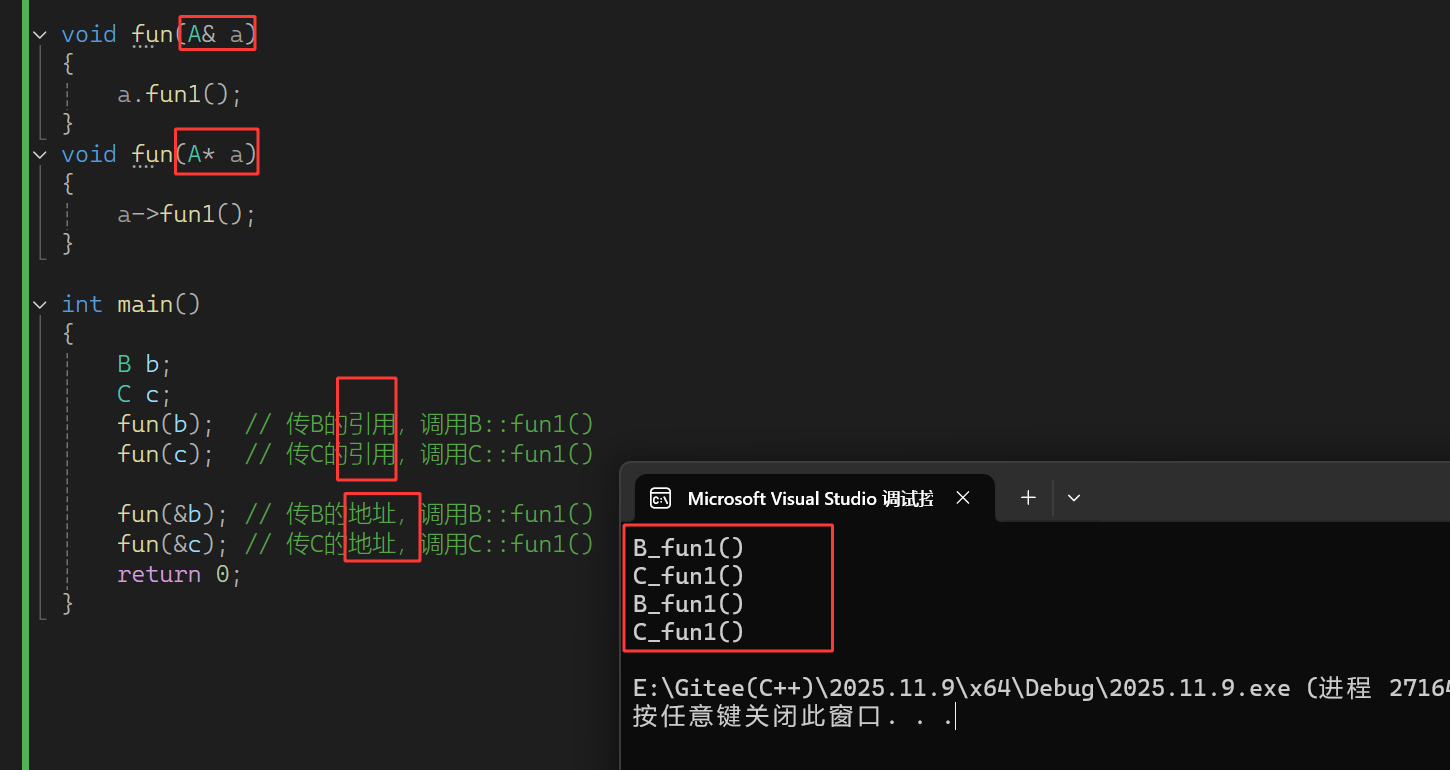 {B b;C c;fun(b); // 传B的引用,调用B::fun1()fun(c); // 传C的引用,调用C::fun1()fun(&b); // 传B的地址,调用B::fun1()fun(&c); // 传C的地址,调用C::fun1()return 0;