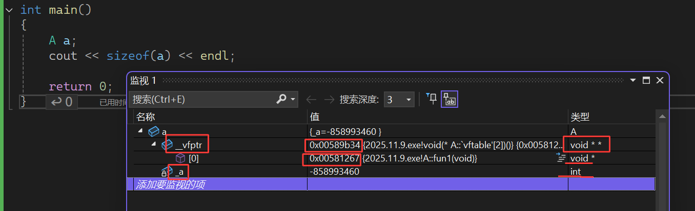观察下面代码中的类A,增加一个虚函数fun2和一个普通函数fun3,那么进行运行代码,观察类a的大小是否仍然为8,同时打开内存窗口观察是否虚函数fun2会被放入函数指针数组中,是否普通函数fun3会被放入函数指针数组中 ?